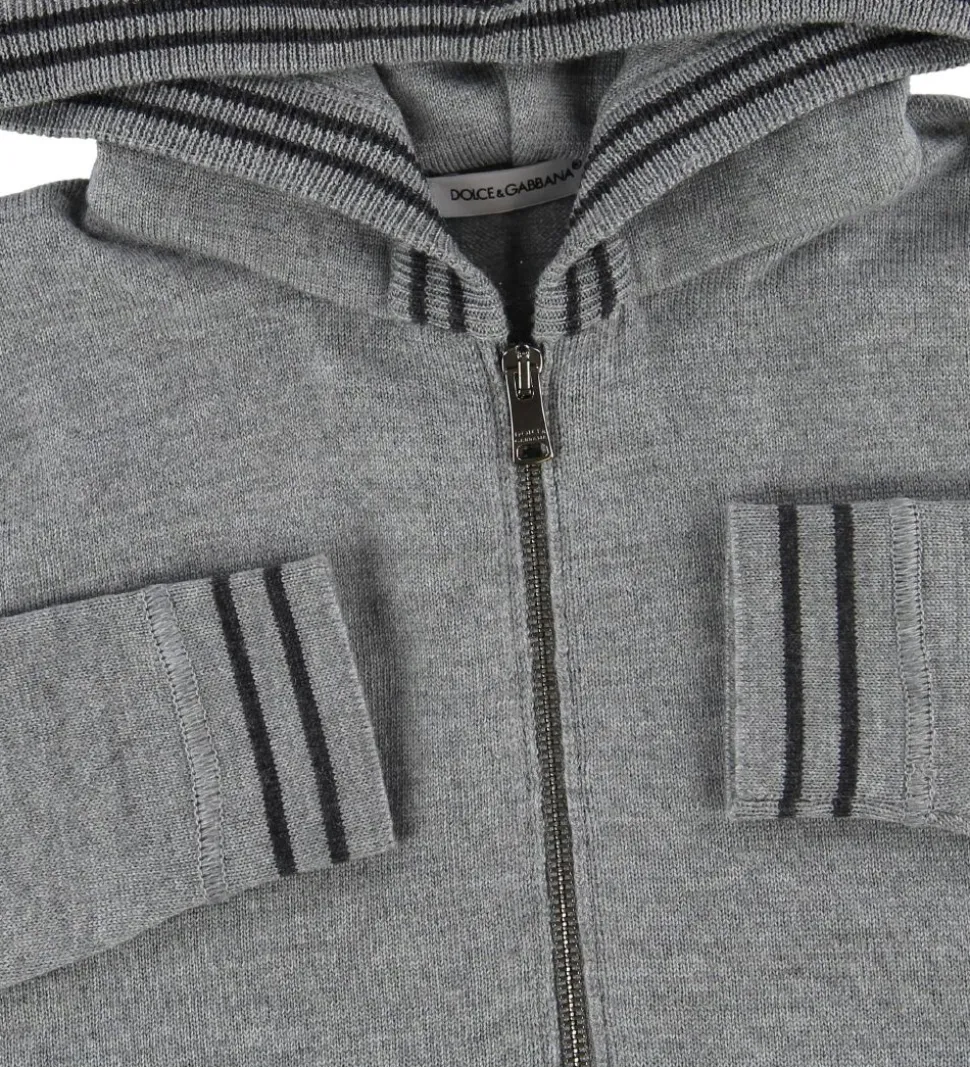 Dolce & Gabbana cardiganen har en fast hætte med en smal ribkant, og der er brede ribkanter på ærmerne og i bunden. Cardiganen åbnes med en sølvfarvet lynlås, og der er praktiske lommer fortil.