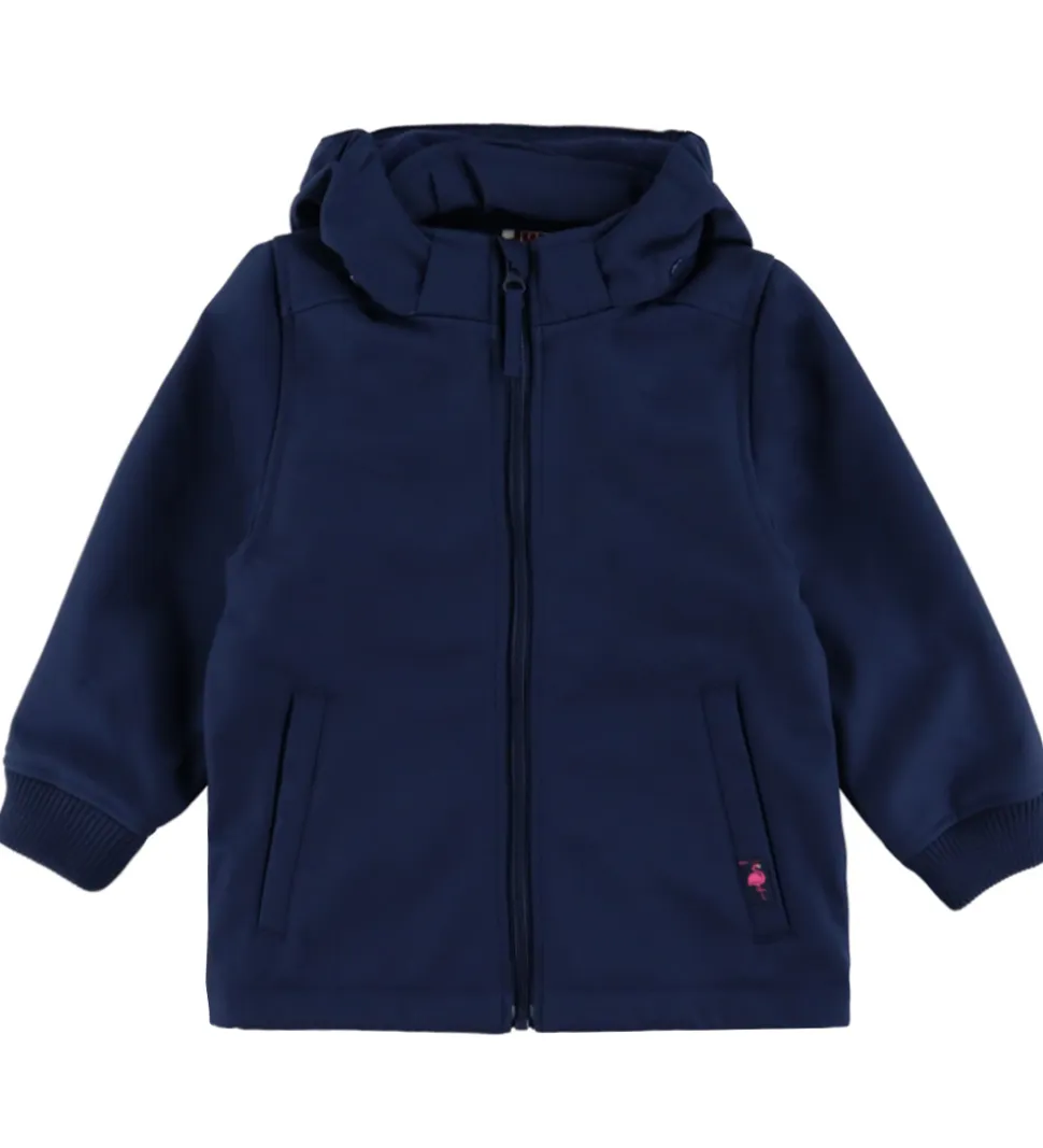 Fin DYR-Cph softshelljakke i navyblå med et stort print af en flamingo på ryggen.