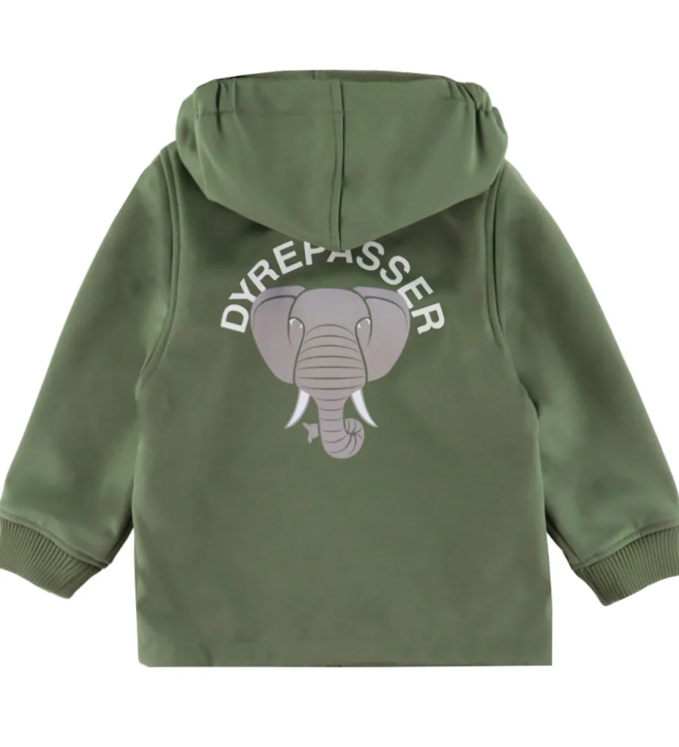 Fin DYR-Cph softshelljakke i støvet grøn med et dyrepasserprint og en elefant på brystet og et stort print af en elefant på ryggen.