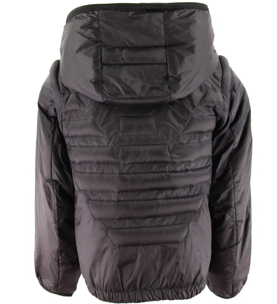 Emporio Armani dunjakken har en fast hætte, og i halsåbningen er der en bred ribkant. Ærmerne har smalle kanter, og i bunden af jakken er der en smal elastikkant. Jakken lukkes med en skjult lynlås med indvendig vindstolpe, og fortil er der åbne lommer.
