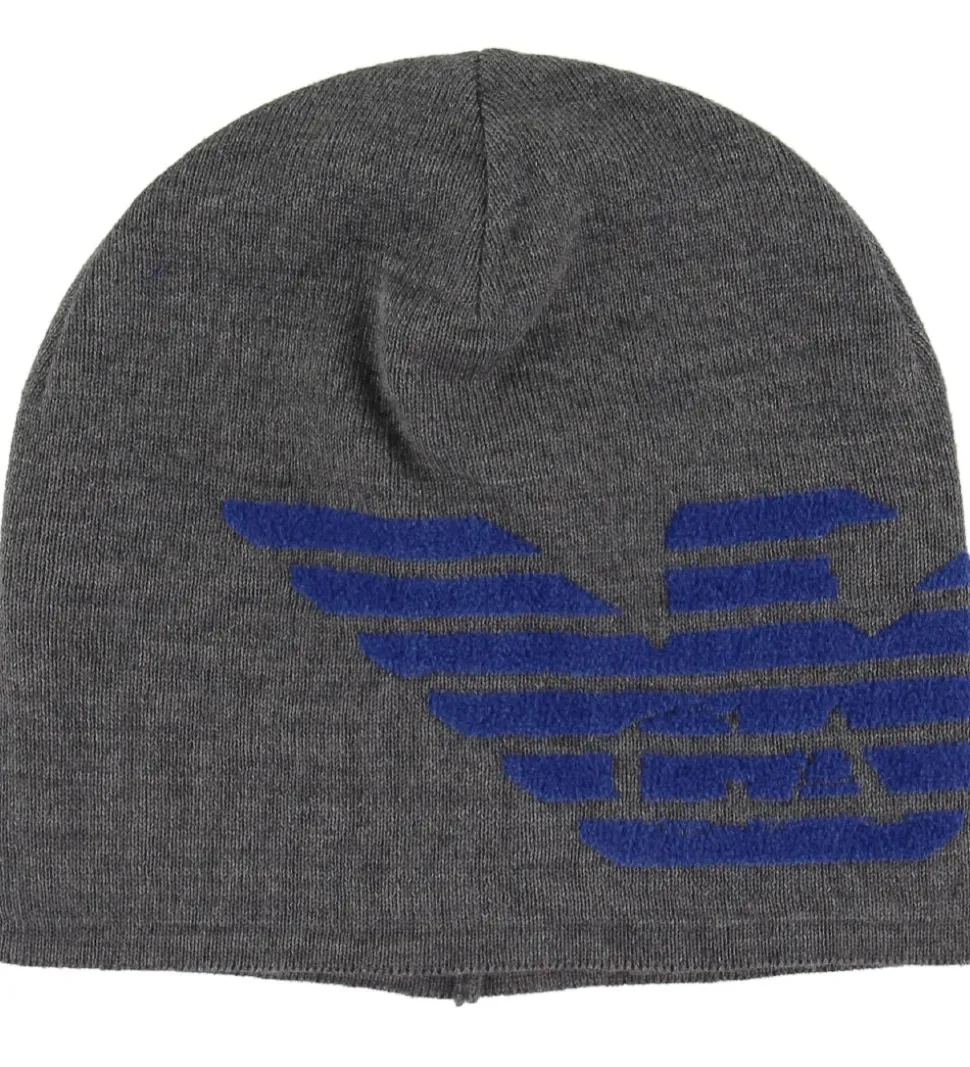Flot Emporio Armani gaveæske med et halstørklæde og en hue i en strikket kvalitet. Huen er grå med et stort, blåt velourlogo fortil. Den ene halvdel af halstørlædet er gråt med teksten “Emp Arm” i blå velour, og på den anden halvdel er lavet af blåt velour med navnet teksten “Emp Arm” i grå. På den modsatte side af halstørklædet er farverne omvendt.
