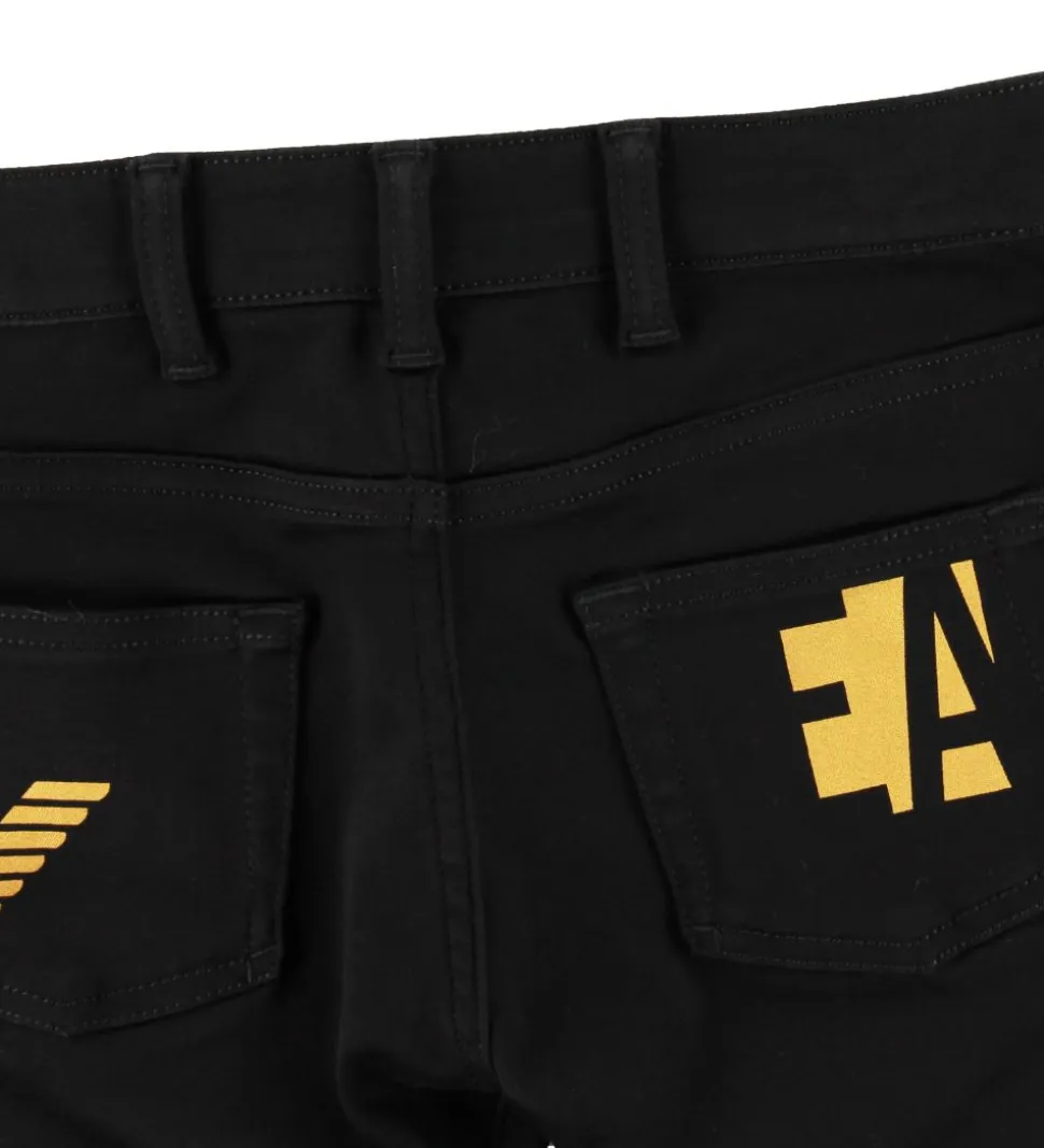 Lækre Emporio Armani jeans i ensfarvet sort og i en strækbar kvalitet. I siderne er der ned langs buksebenene en smal sort kant i glatvævet kvalitet.