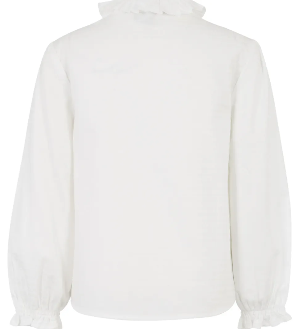 Emporio Armani skjorten har lange ærmer med smalle elastikkanter og fine flæseafslutninger. I halsåbingen er der en sød flæsekant, og midt på skjorten er der ned ad den øverste halvdel endnu en flæse. Skjorten lukkes med knapper hele vejen ned.