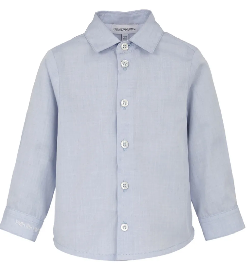 Emporio Armani skjorten har lange ærmer med brede rkanter og to hvide knappper. I halsåbningen har den en klassisk krave, og skjorten lukkes med hvide knapper.