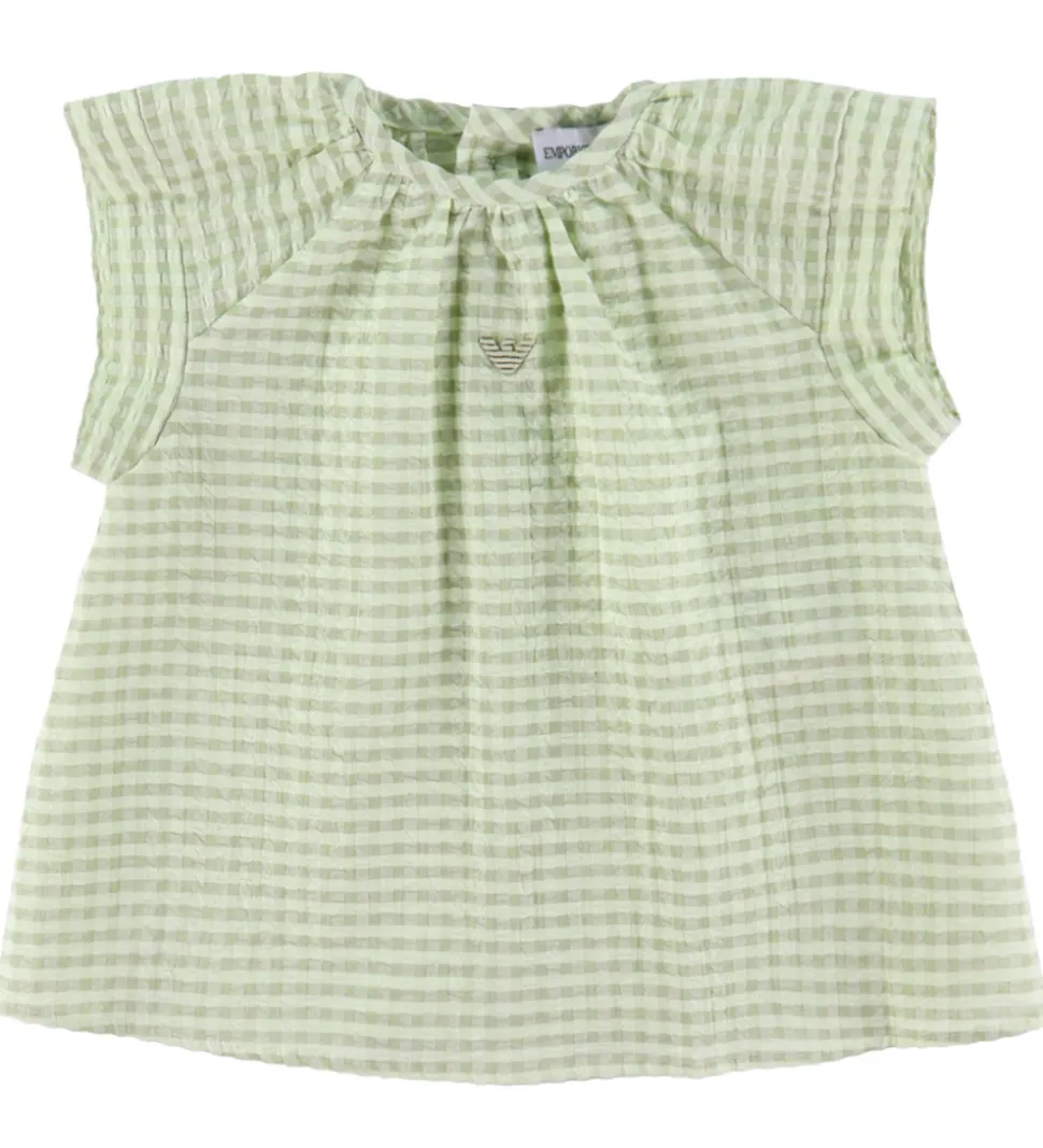 Sødt Emporio Armani sommersæt, der består af en top og et par shorts med et ternet mønster i rosa og hvid og med en crepestruktur. Sættet er lavet i en let, fastvævet bomuldskvalitet.