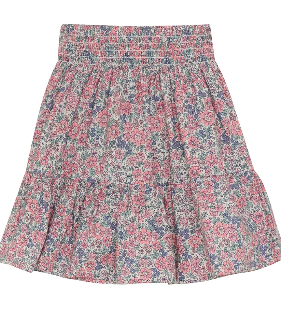 Sød En Fant nederdel i en lys farve med fint blomsterprint i rosa, blå og grønne nuancer. Nederdelen har en bred elastisk talje, der giver en komfortabel pasform og bevægelsesfrihed. Skørtet har en syning på midten, som giver fine folder og ekstra vidde til den nederste del.