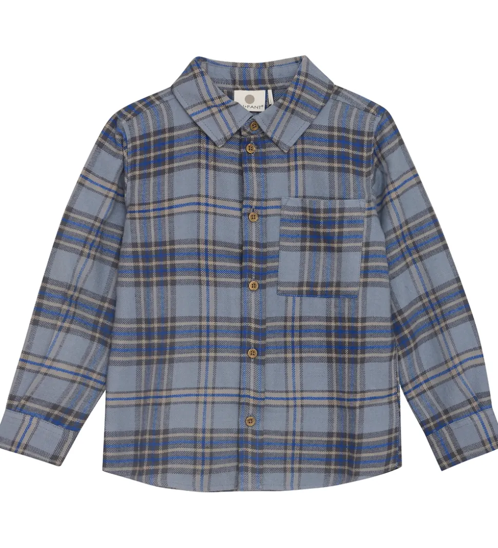 Attraktiv En Fant skjorte med et klassisk, ternet mønster i blå og grå nuancer.