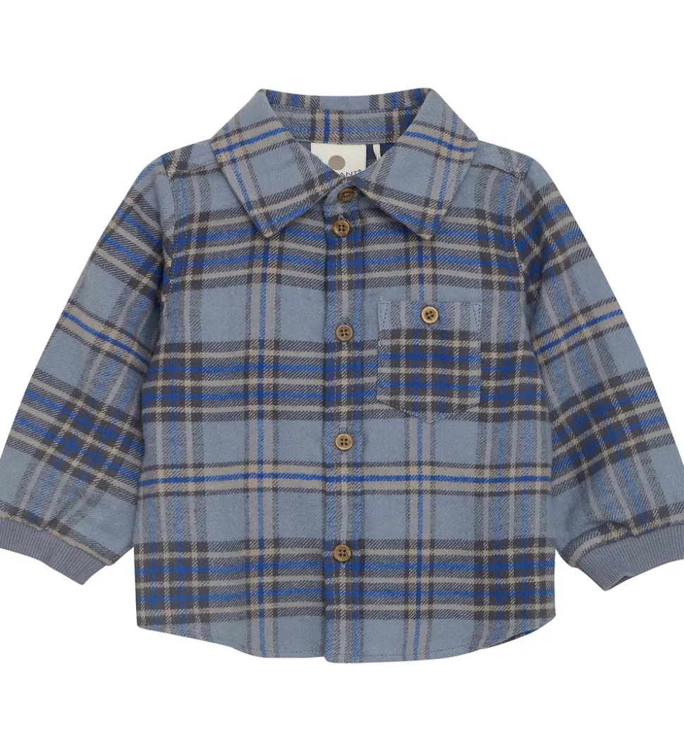 Stilfuld En Fant skjorte med et klassisk, ternet mønster i blå og grå nuancer. Skjorten har lange ærmer og en enkelt brystlomme, der tilføjer en praktisk detalje. En Fant tilbyder en model med knaplukning og ribkant ved ærmerne.
