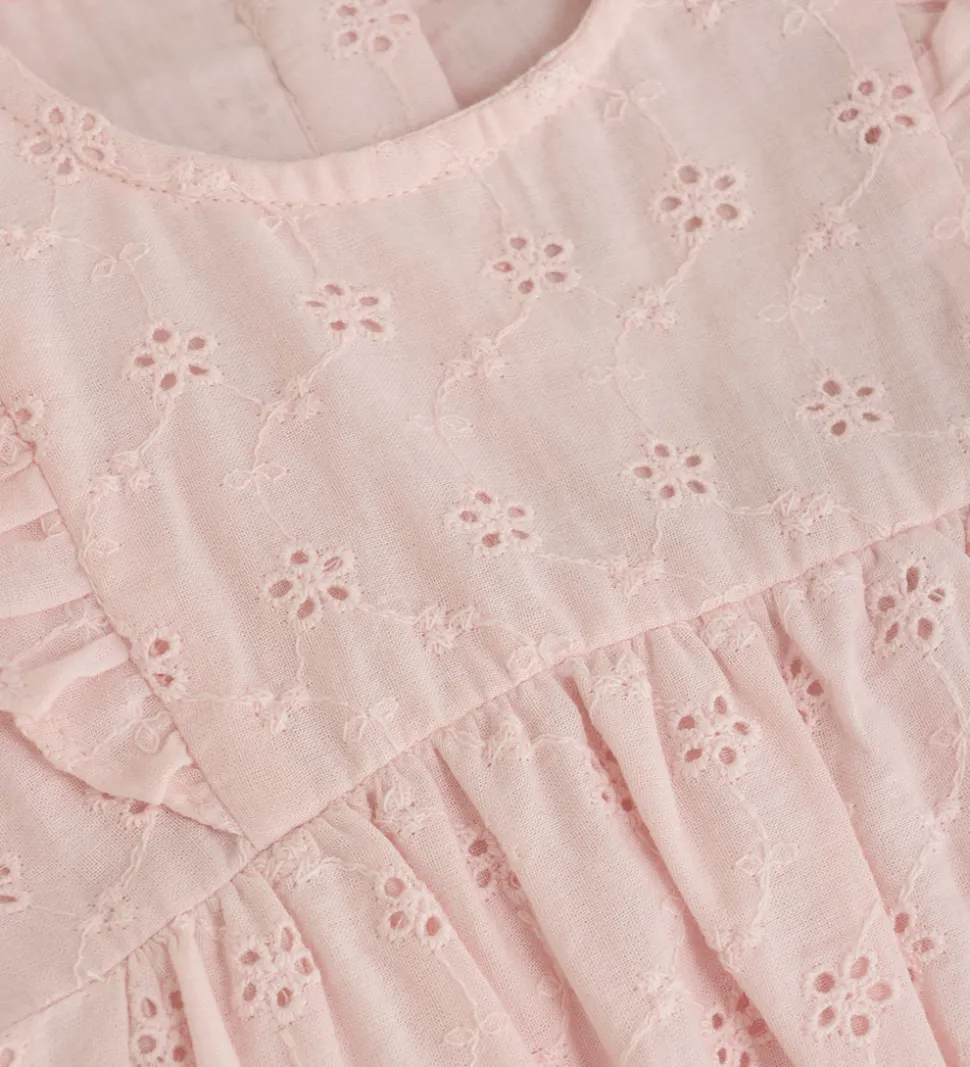 Fin sommerdragt fra En Fant i lys rosa med små, broderede blomster. Sommerdragten har en rund halsudskæring med trykknapper i nakken og er uden ærmer. Den har flæser ved skuldrene og i benåbningerne. Sommerdragten lukkes med trykknapper mellem benene.