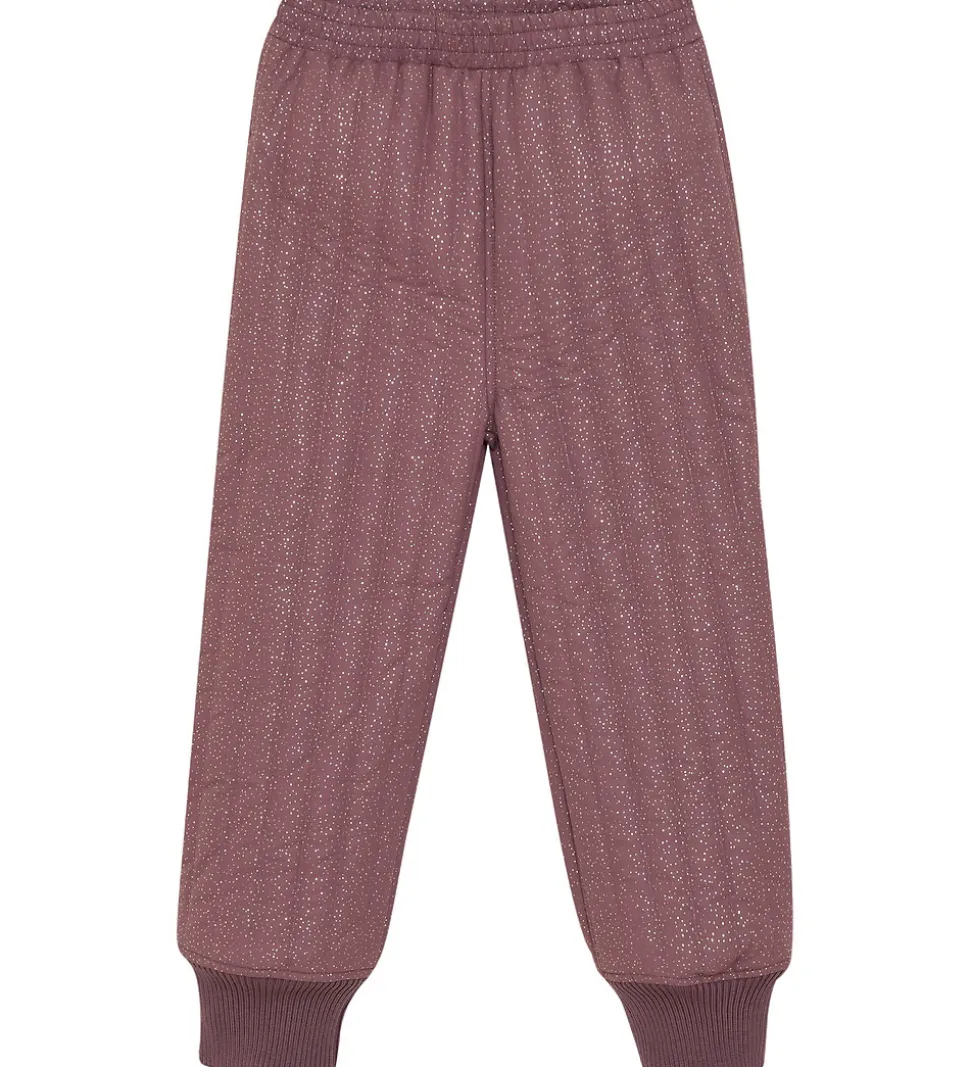 Fint En Fant termotøj i mørk rosa et allovermønster af guldprikker samt med en indpræget struktur i lodrette linjer. Sættet består af en termojakke med flotte flæser omkring skuldrene og et par termobukser.