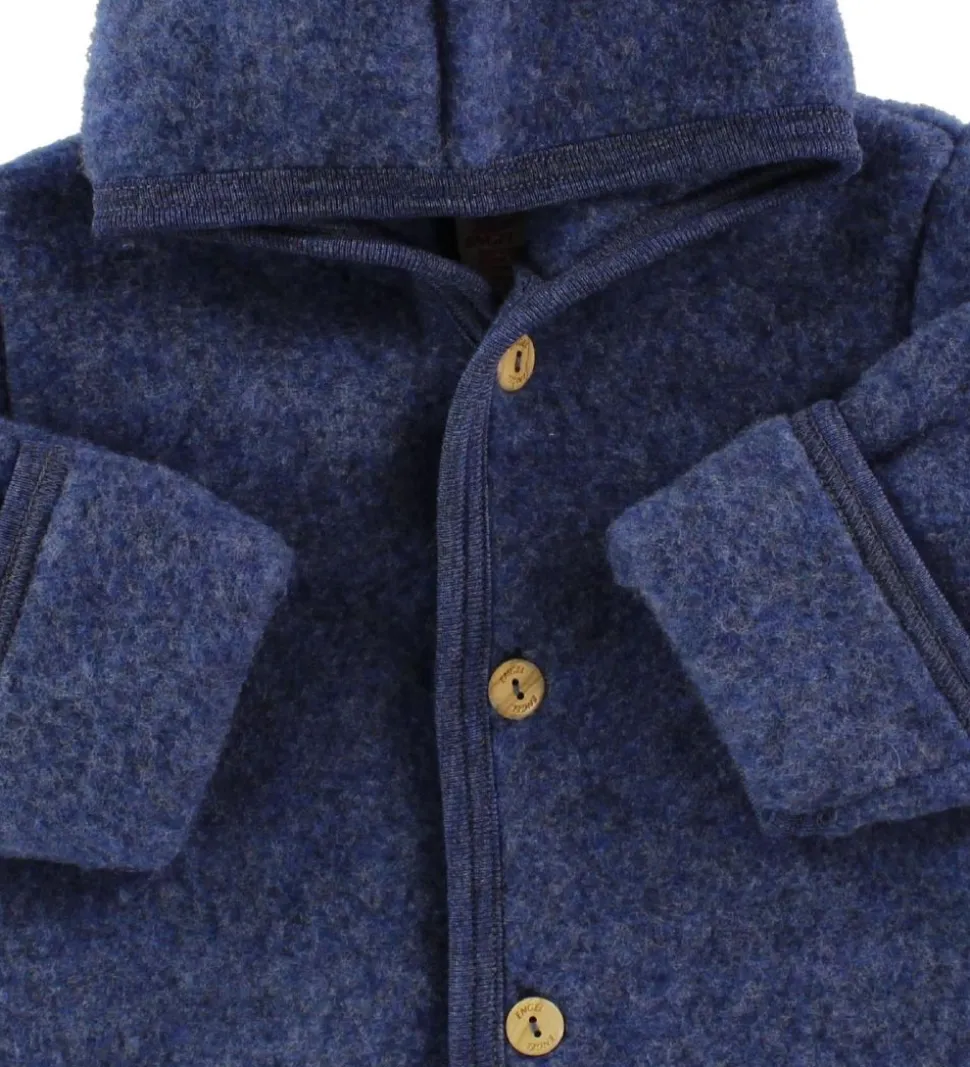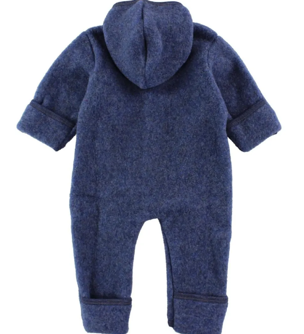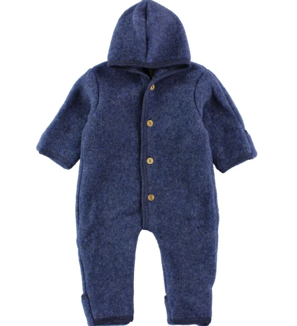 Engel køredragten har en fast hætte og en gennemgående knappeåbning med fine træknapper. Den har lange ærmer og ben, der er kantet med en blød, smal kant. Dragten har praktiske ombuk ved hænder og fødder.