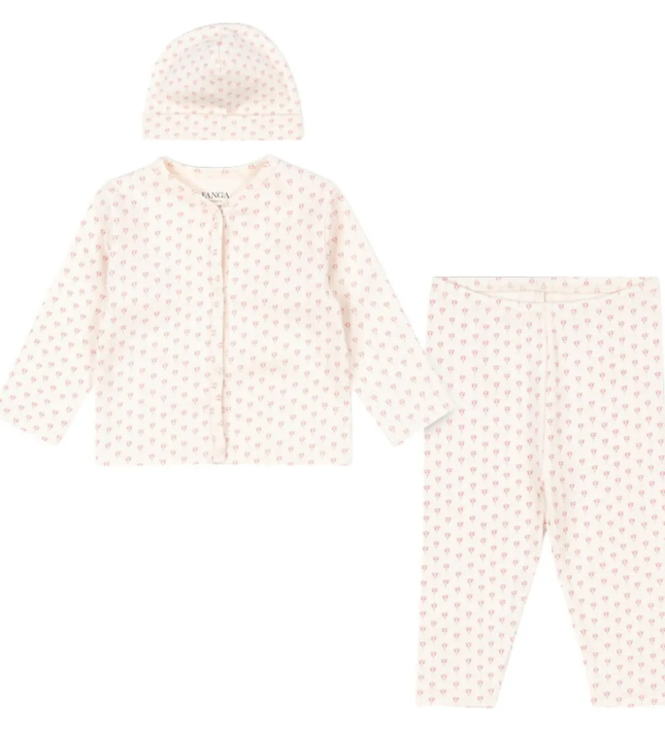 Dejligt Fanga Fontana sæt med en cardigan, et par leggings og en hue. Sætter er i cremehvid med et diskret print af små, rosa motiver.