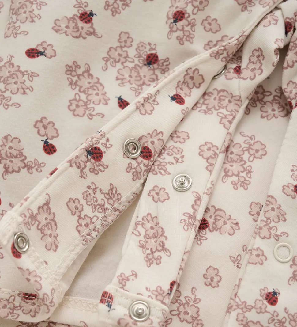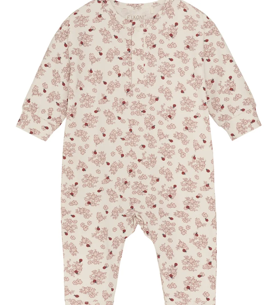 Flot Fixoni heldragt i en lys beige nuance, prydet med et fint blomster- og marihøneprint i rosa og røde nuancer. Designet sikrer komfort, mens det søde print gør den til en skøn tilføjelse til børnegarderoben.