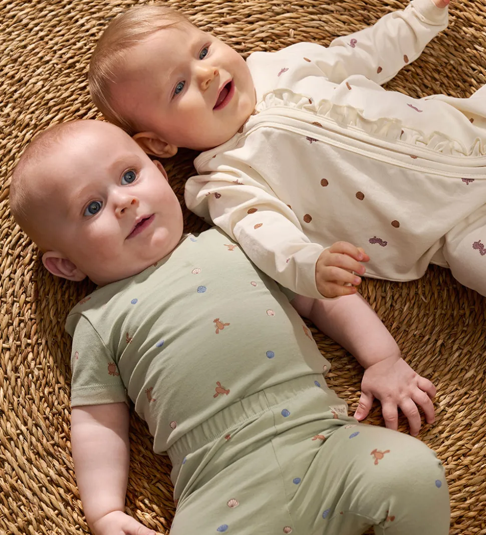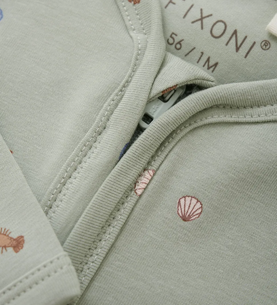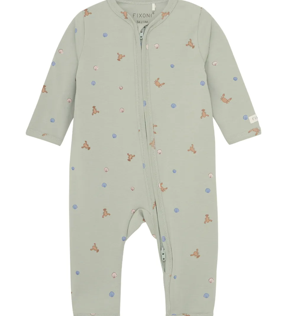 Skøn Fixoni natdragt i støvet lysegrøn med print af muslinger og hummere i hvide, blå og røde nuancer. Den åbnes med en lynlås med to skydere, der går fra halsen og ned til det ene ben. Natdragten har en rund halsudskæring, lange ærmer og lange ben.