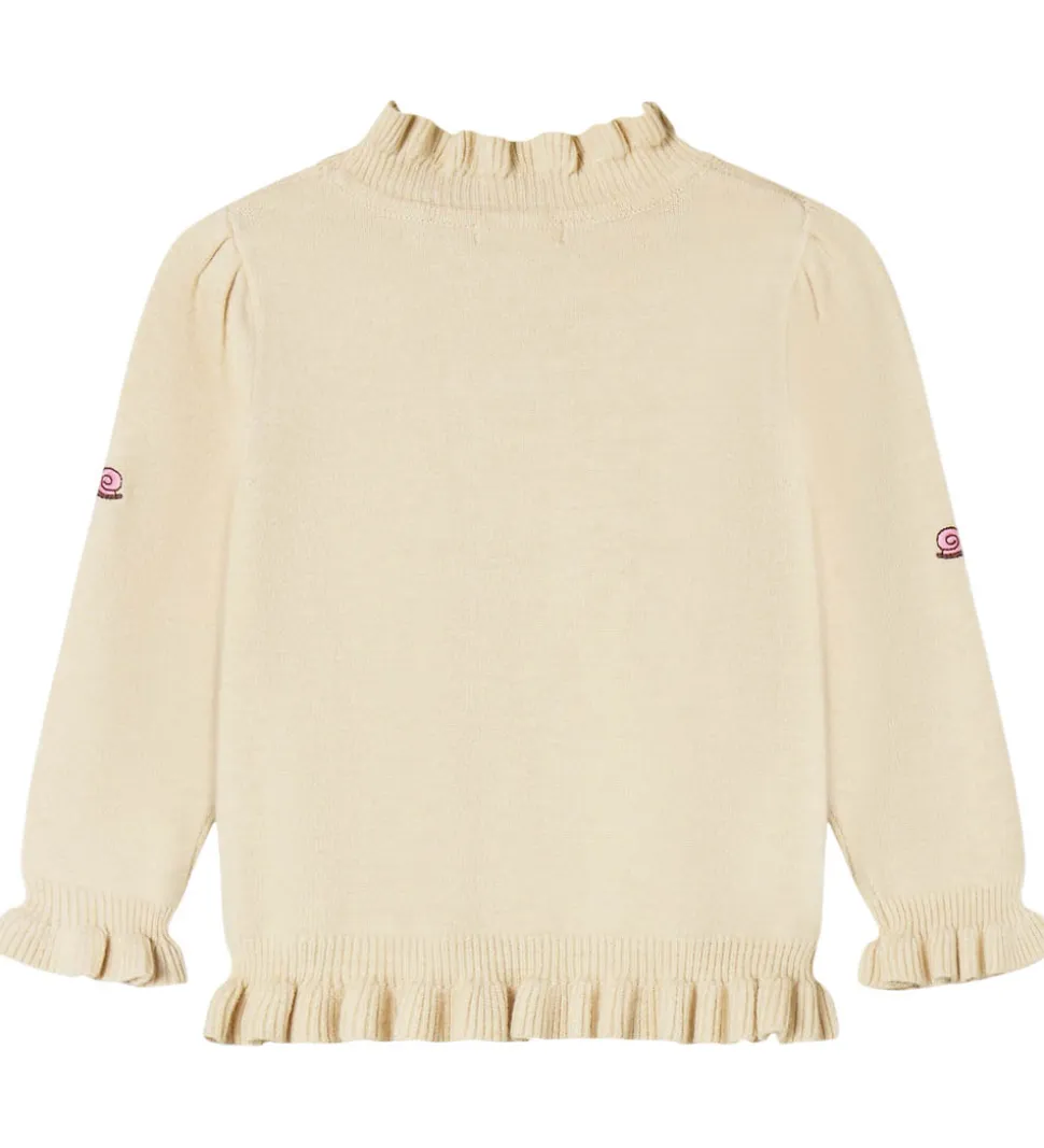 Charmerende Fliink bluse i lys beige strik med små, broderede snegle i brun og rosa. Blusen har en mellemhøj hals med flæsekant. Den har lange ærmer med rynker ved skuldrene og flæseafslutning i ærme- og taljeåbning.