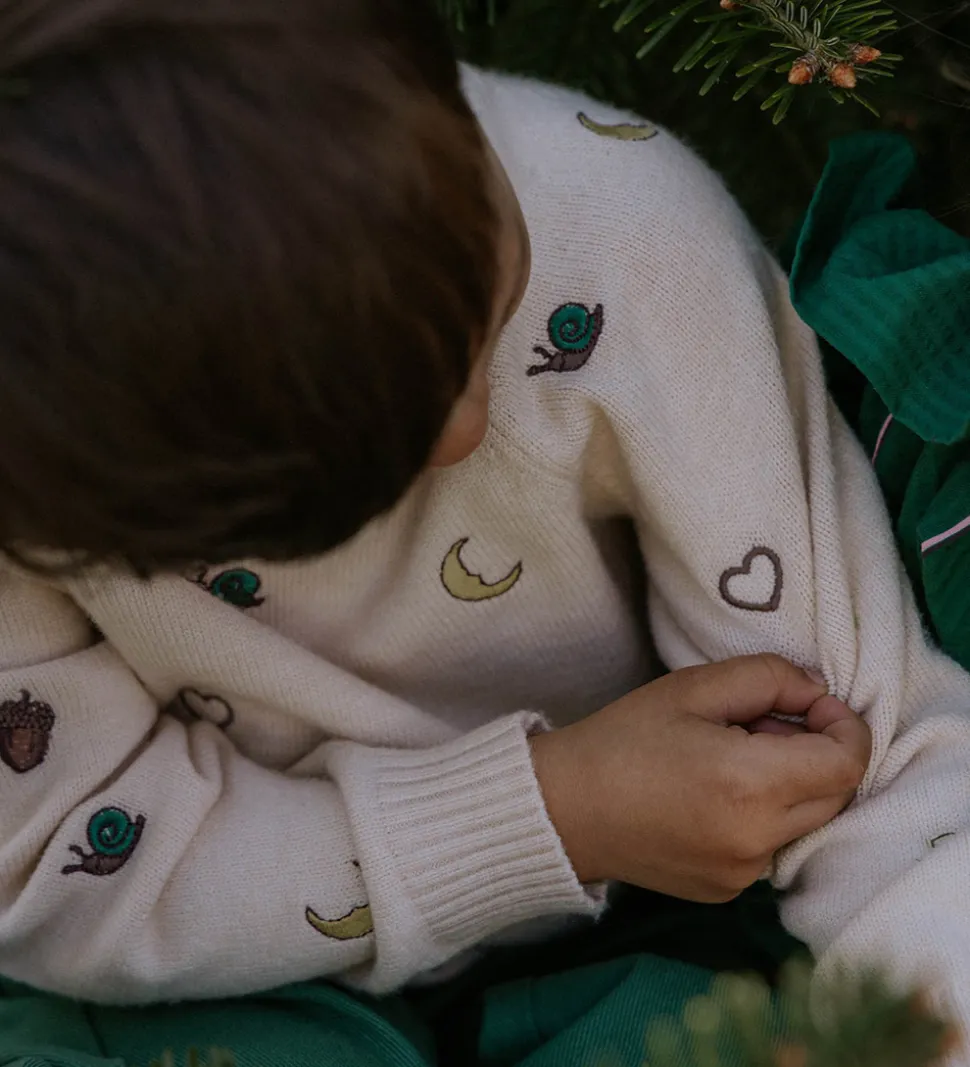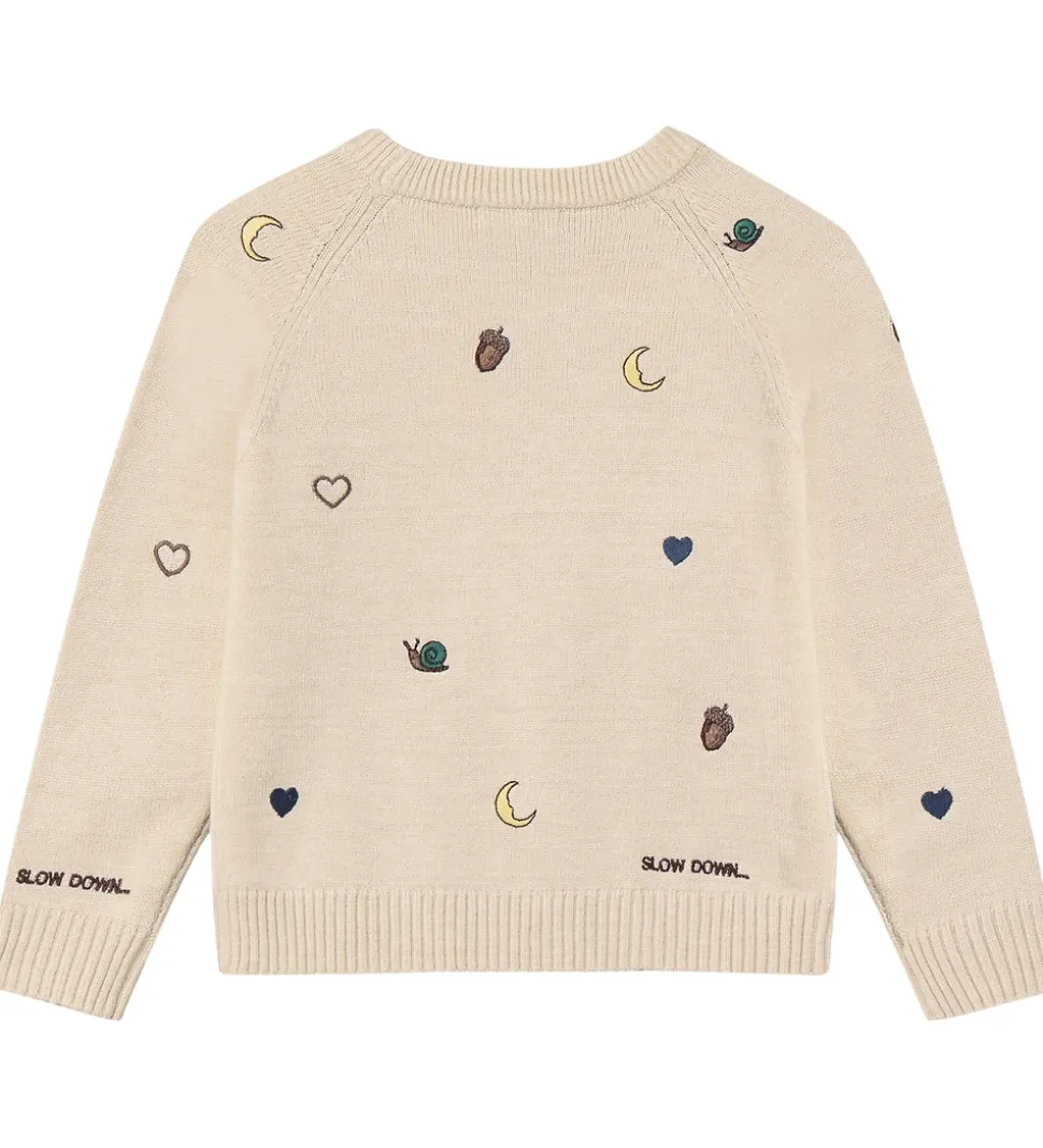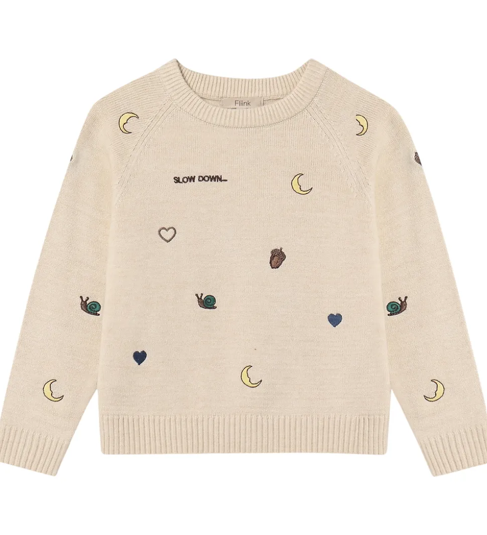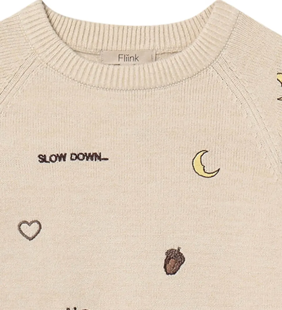 Flot Fliink bluse i en lys beige farve med fine broderier af bl.a. hjerter, måner og teksten “Slow Down”. Den har en rund halsudskæring og lange ærmer med ribkanter.