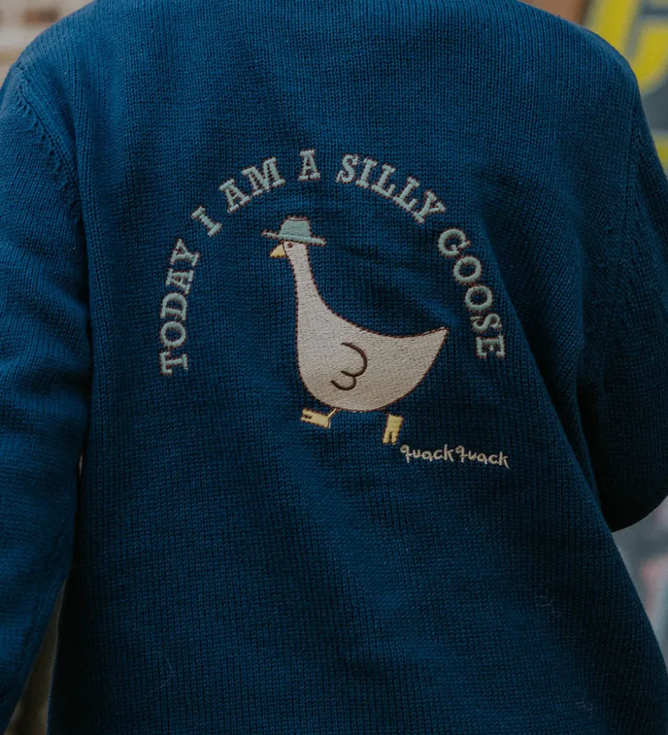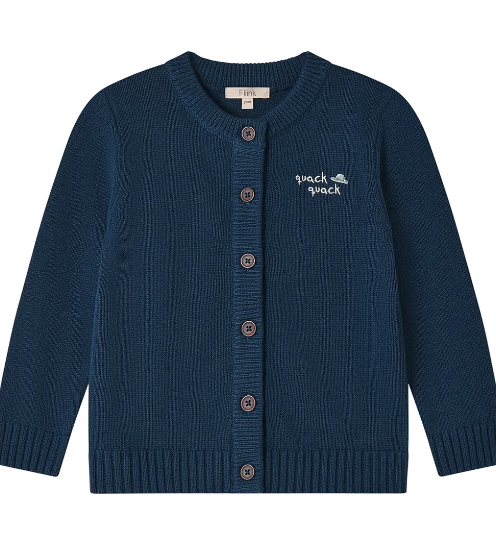 Stilfuld Fliink cardigan i en dyb, blå farve med lange ærmer. Fliink cardiganen er udsmykket med en tekst broderet på brystet, der siger “quack quack”, samt med en broderet and på ryggen.