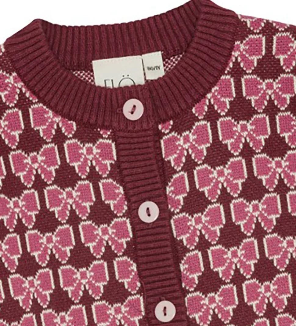 Flot Flöss cardigan i en dyb bordeauxrød med et flot mønster af lyserøde sløjfer.