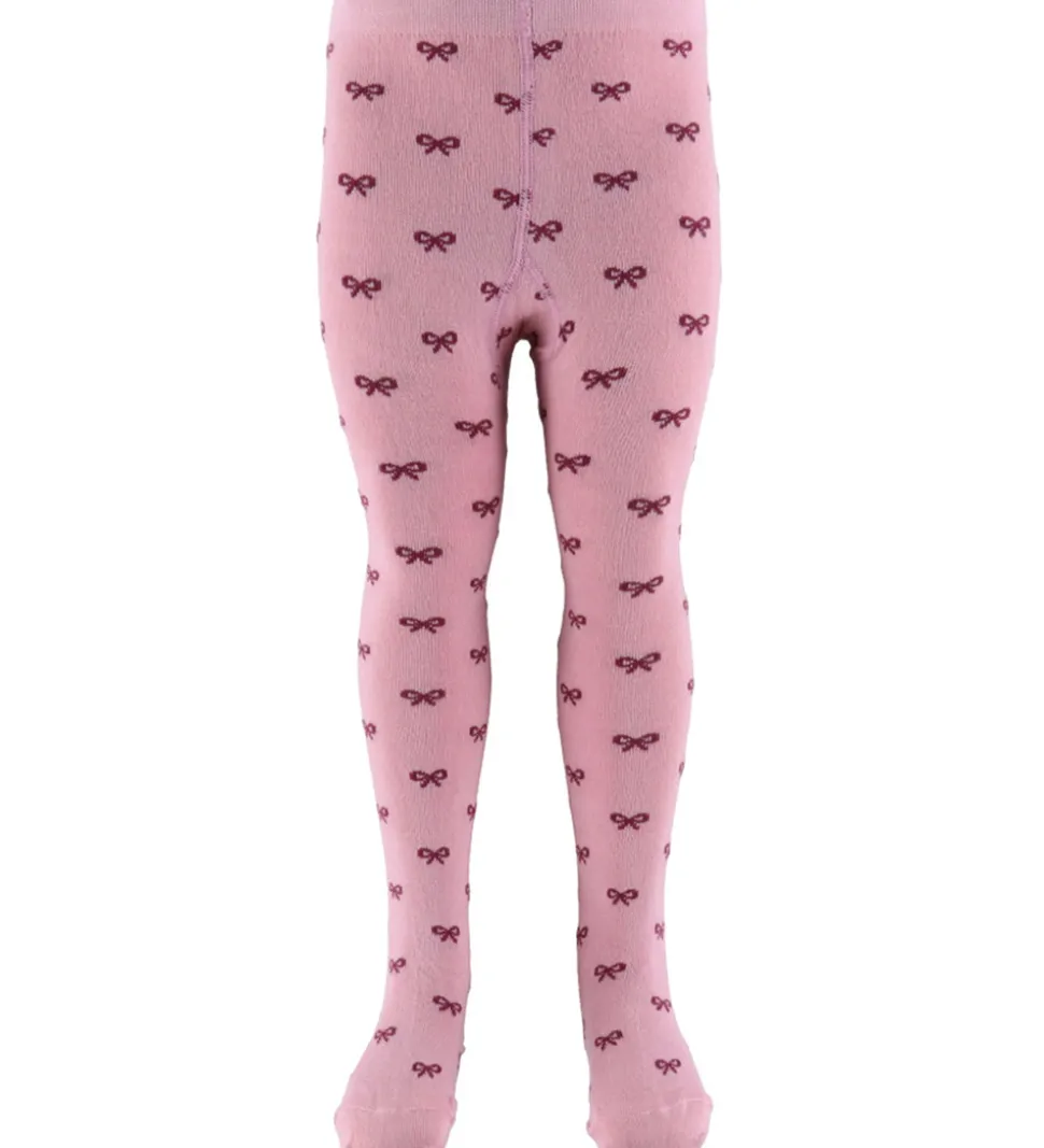 Søde Fuzzies strømpebukser i rosa med et print med små bordeauxrøde sløjfer.