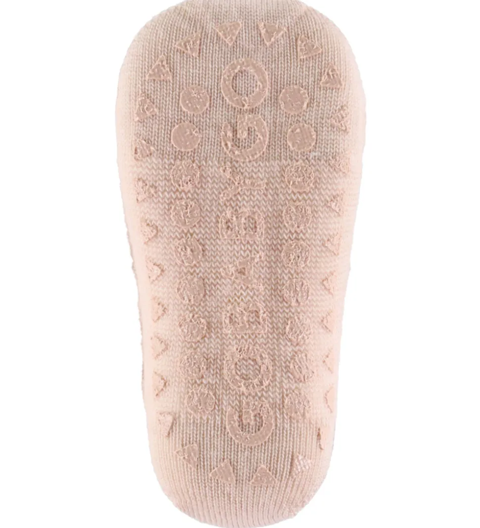 Fine GoBabyGo kravlestrømpebukser i pudderrosa, og de har gummidutter på og under foden samt på knæene.