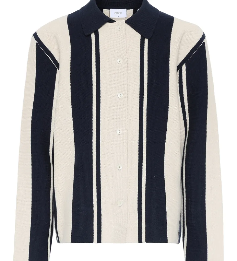 Stilfuld Grunt cardigan med brede lodrette striber i navyblå og beige. Grunt cardiganen har en strikket struktur med en klassisk krave og gennemgående knaplukning foran.