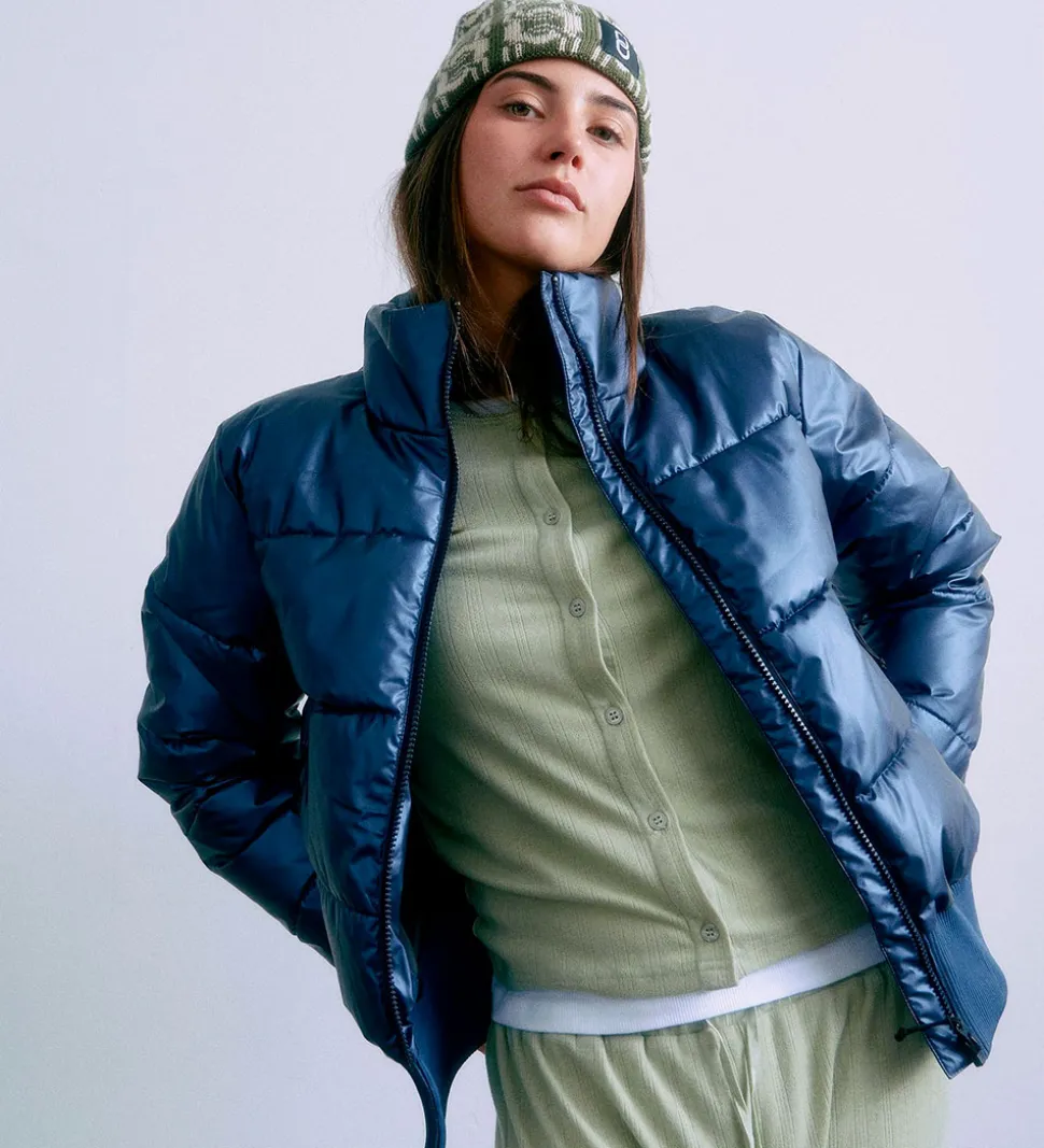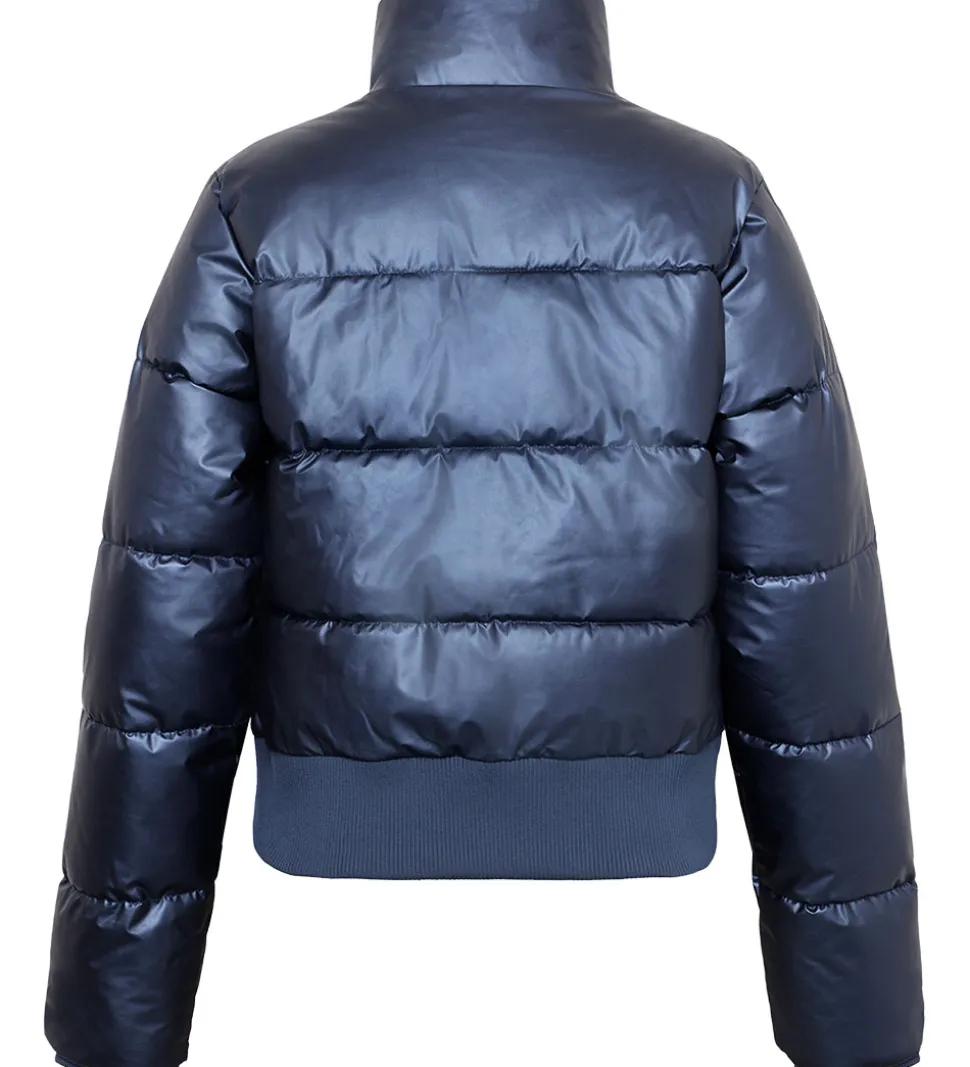 Flot Grunt dynejakke i en skinnende, mørkeblå nuance. Dynejakken har vandrette syninger, der giver et klassisk moderne udtryk.