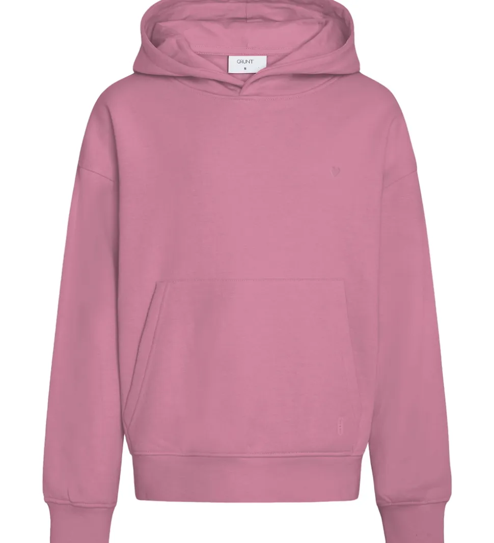 Flot Grunt hættetrøje i lyserød sweat, og på ryggen er der et stort, hvidt print. Grunt hættetrøjen har en klassisk kængurulomme foran og en rummelig hætte. Den har brede ribkanter, der giver en god pasform, og på indersiden er der blødt, børstet bomuld.