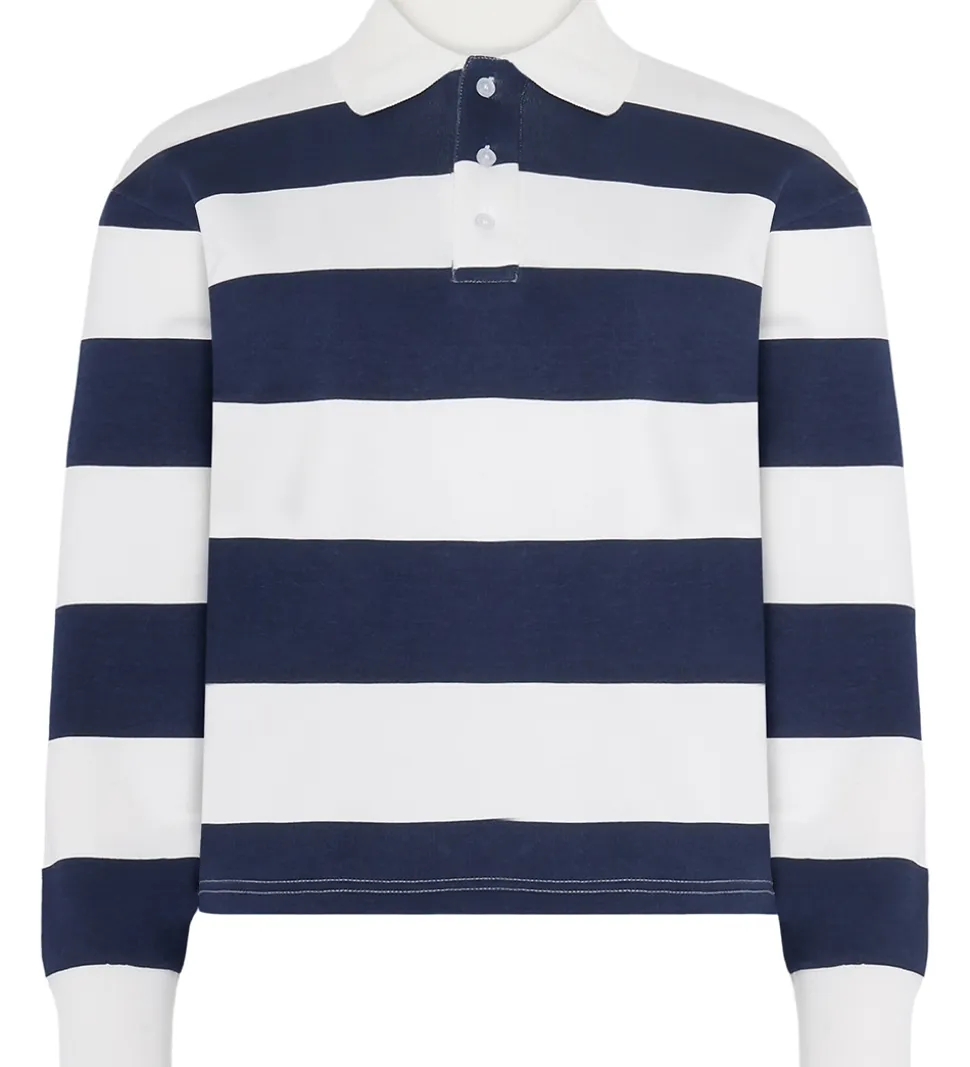 Stilfuld Grunt polobluse i stribet mørkeblå og hvid i lækker sweatkvalitet. Poloblusen har en klassisk krave og to knapper fortil. Den har lange ærmer med brede ribkanter, og i bunden er der en kort slids i begge sider. Indvendigt er der blødt, børstet bomuld.