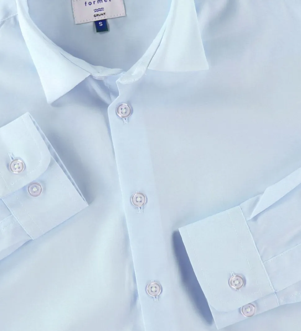 Grunt skjorten har lange ærmer med manchetknapper ved håndleddene. I halsåbningen er der en klassisk krave. Fortil åbnes skjorten med hvide knapper.