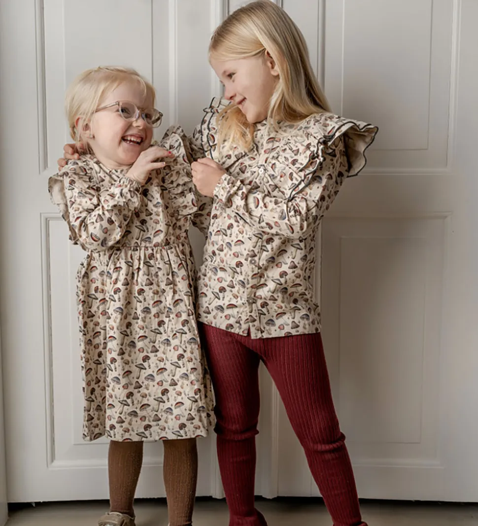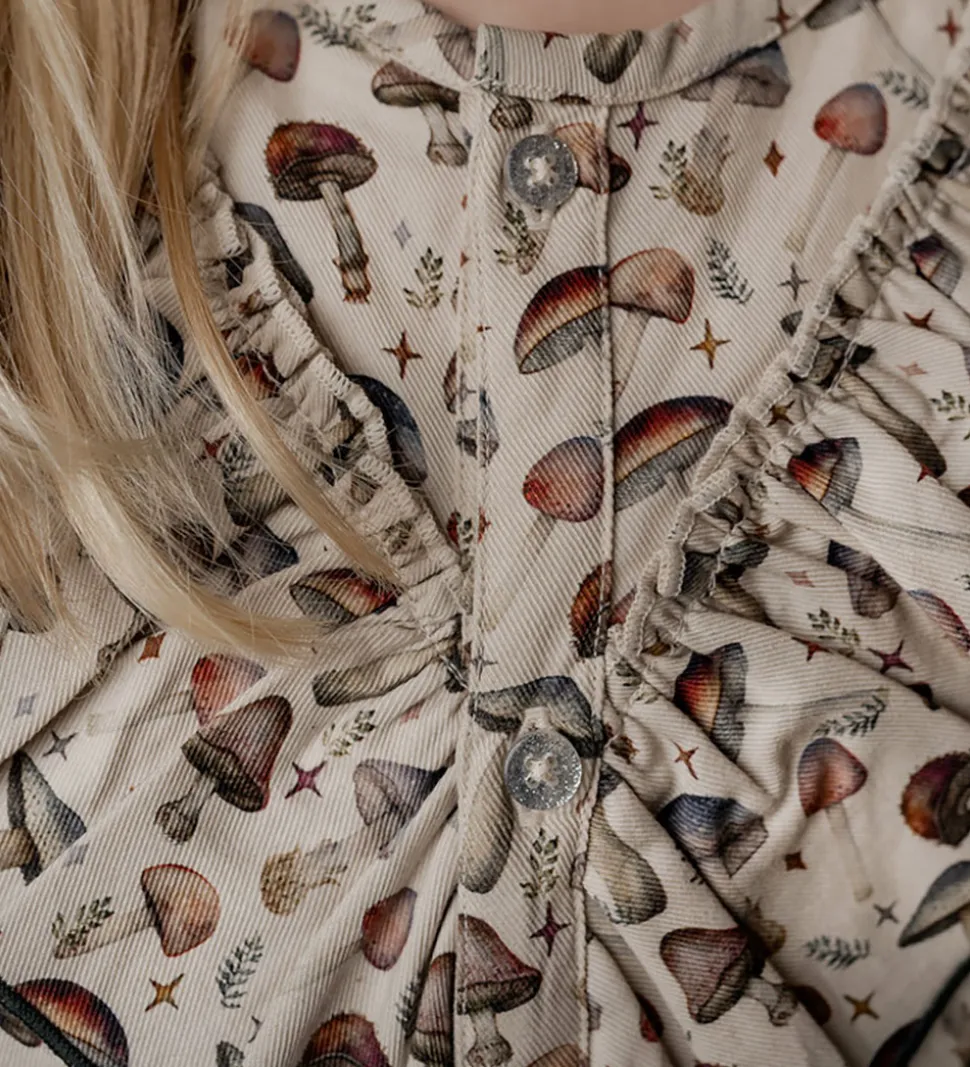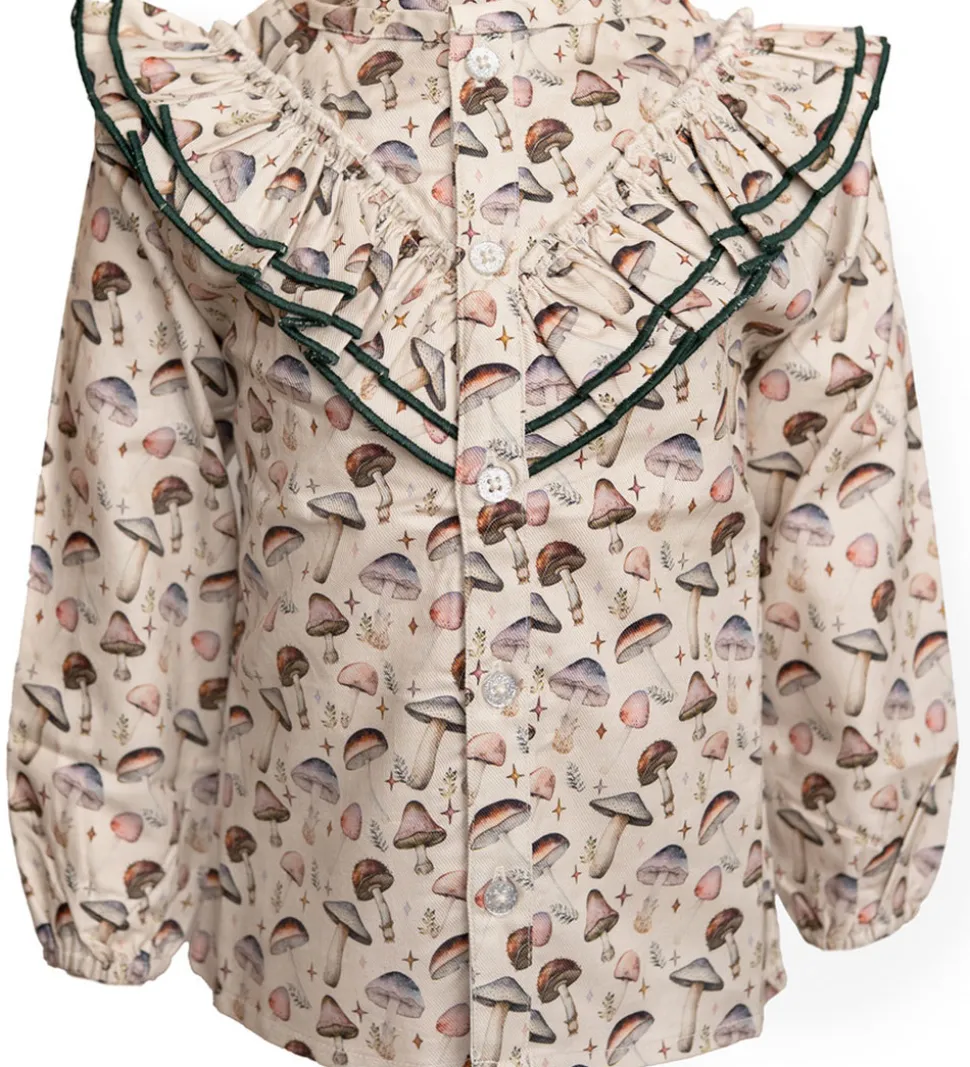 Charmerende Hanevild skjorte i beige med lange ærmer og et fint svampeprint i bløde nuancer. Skjorten fremhæver en flot krave med dekorative flæsedetaljer og knapper foran. Hanevild tilbyder en skjorte, der kombinerer et smukt mønster med stilfulde detaljer.