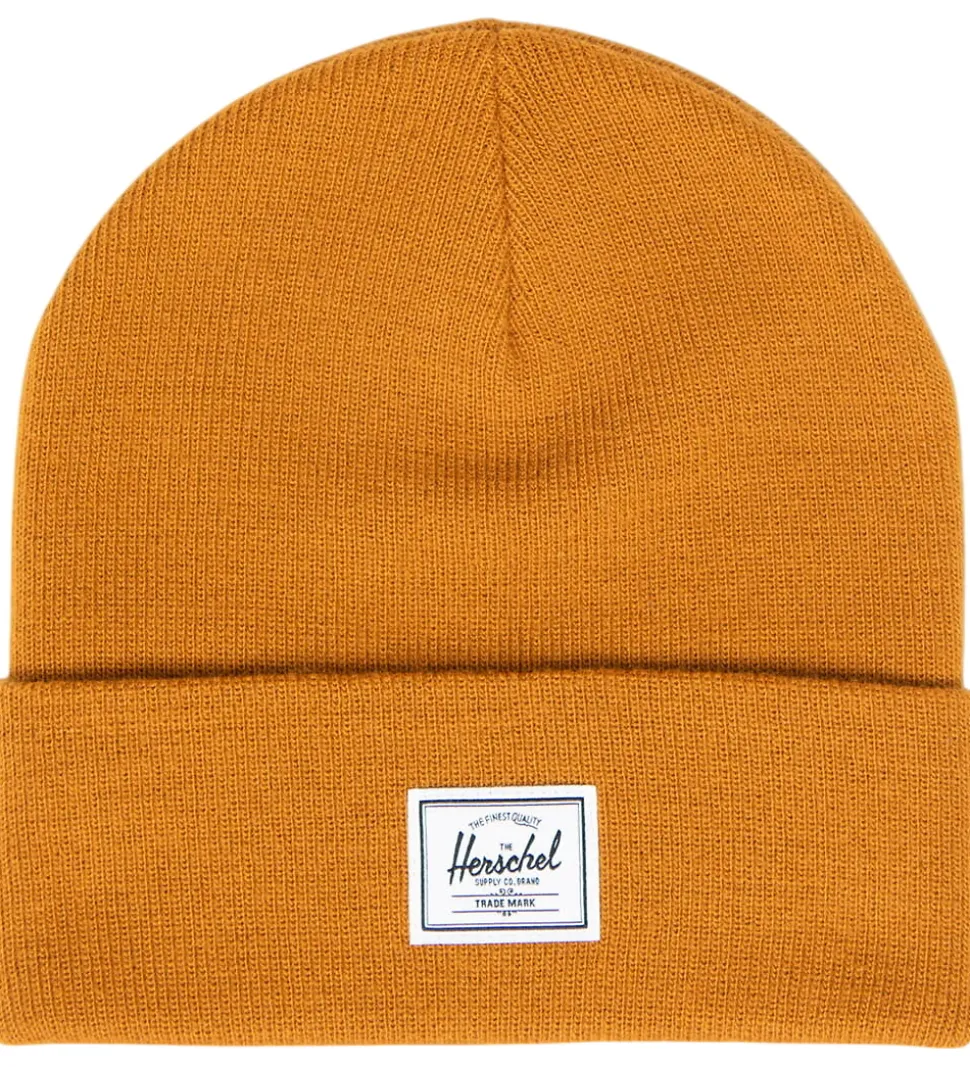 Flot Herschel hue i karrygul med et hvidt logo på fronten. Huen består af to lag. Den er fremstillet i en blød, strikket kvalitet med en rund hovedform og et bredt ombuk nederst.