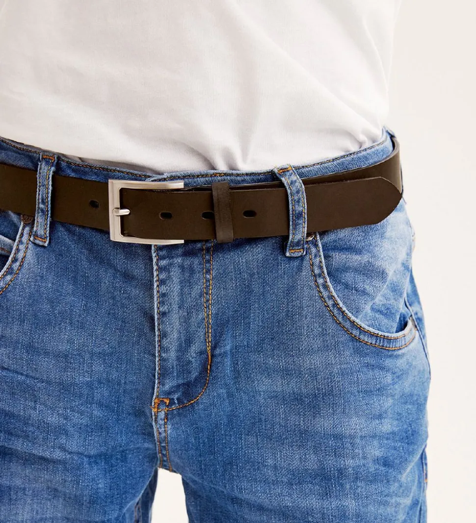 Fin Hound bælte med en smal, mørkebrun rem i læder, og et firkantet bælte-spænde i sølvskinnende metal.