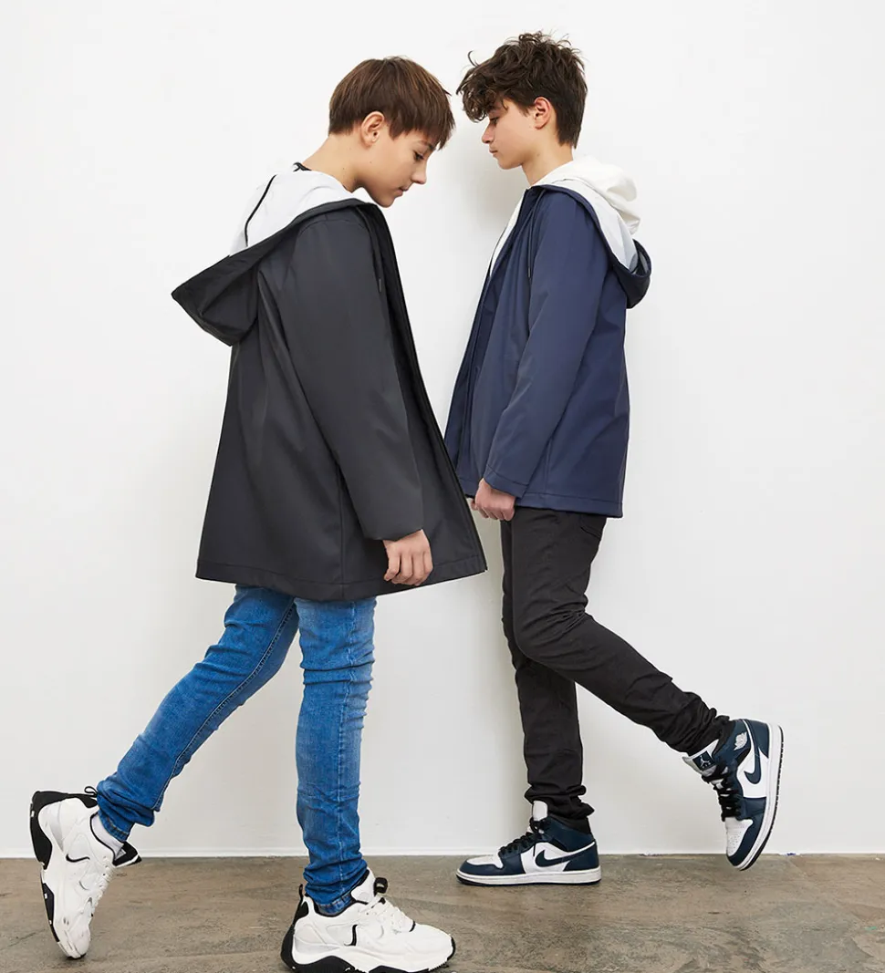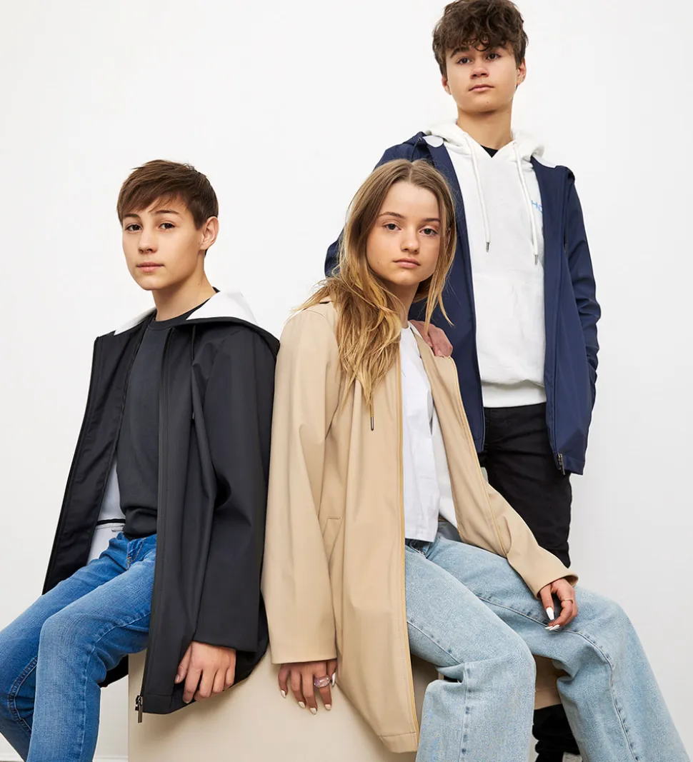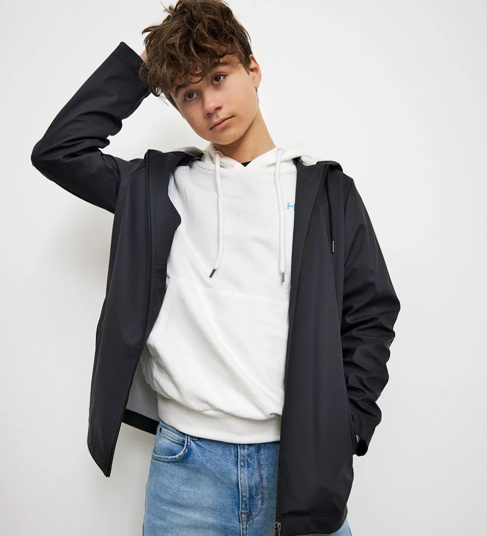 Hound regnjakken har en fast hætte, som kan strammes ind med en snøre, og regnjakken lukkes med en lynlås. I siderne er der praktiske lommer, som lukkes med en skjult trykknap.