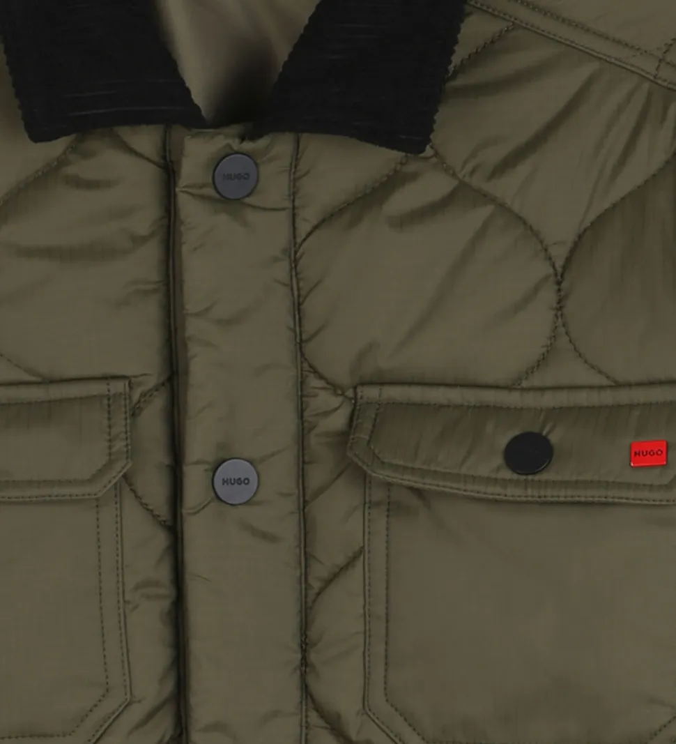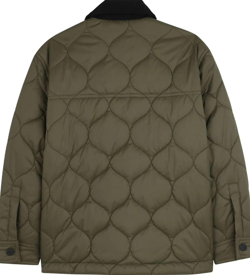 Skøn HUGO dynejakke i armygrøn i en glatvævet kvalitet og et quiltet mønster. Kraven er lavet af sort fløjl, og den har sorte knapper.