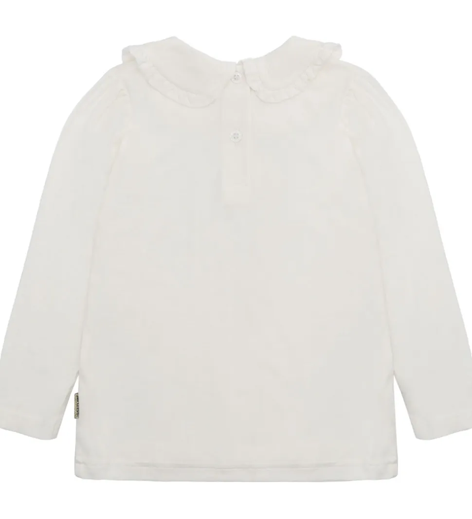 Elegant bluse fra Hust and Claire i en enkel hvid farve. Blusen har lange ærmer og en rund halsudskæring med fine flæsedetaljer langs kanten af kraven. Hust and Claire blusen lukkes i nakken med knapper.