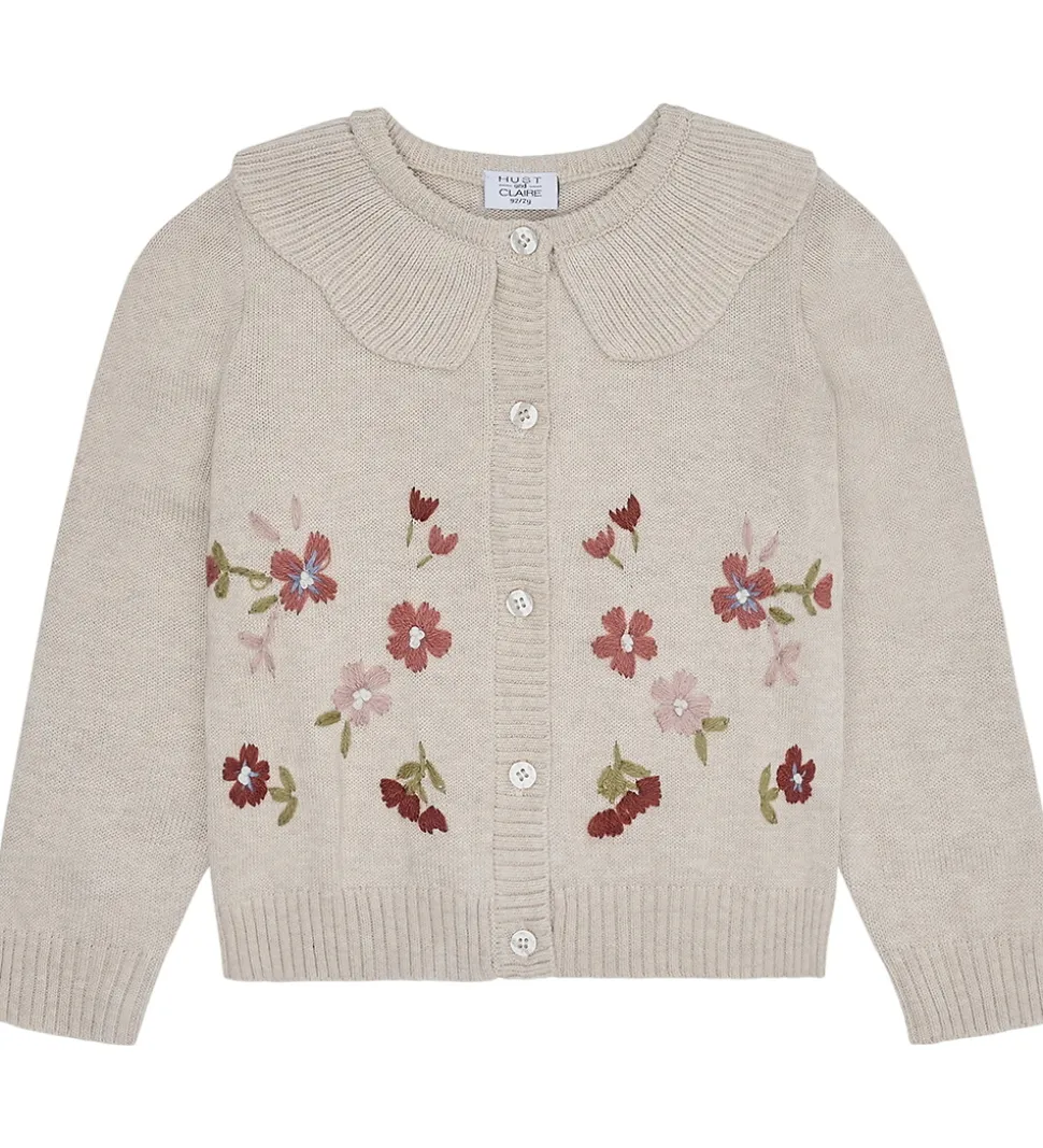 Charmerende Hust and Claire cardigan i lys beige strik med broderede blomster på fronten i rosa og grønne nuancer. Cardiganen har en elegant krave og lukkes med knapper foran. Den har ribkanterne ved ærmer og bund, som giver cardiganen en god pasform.