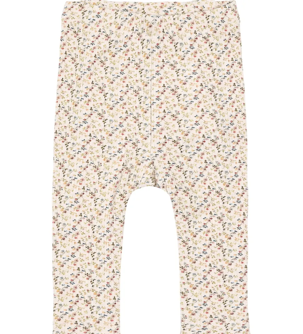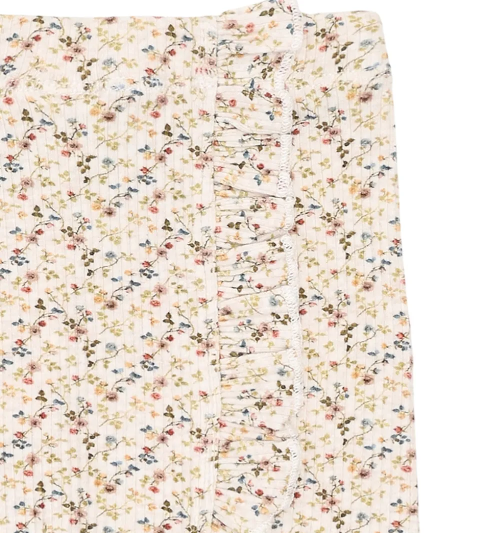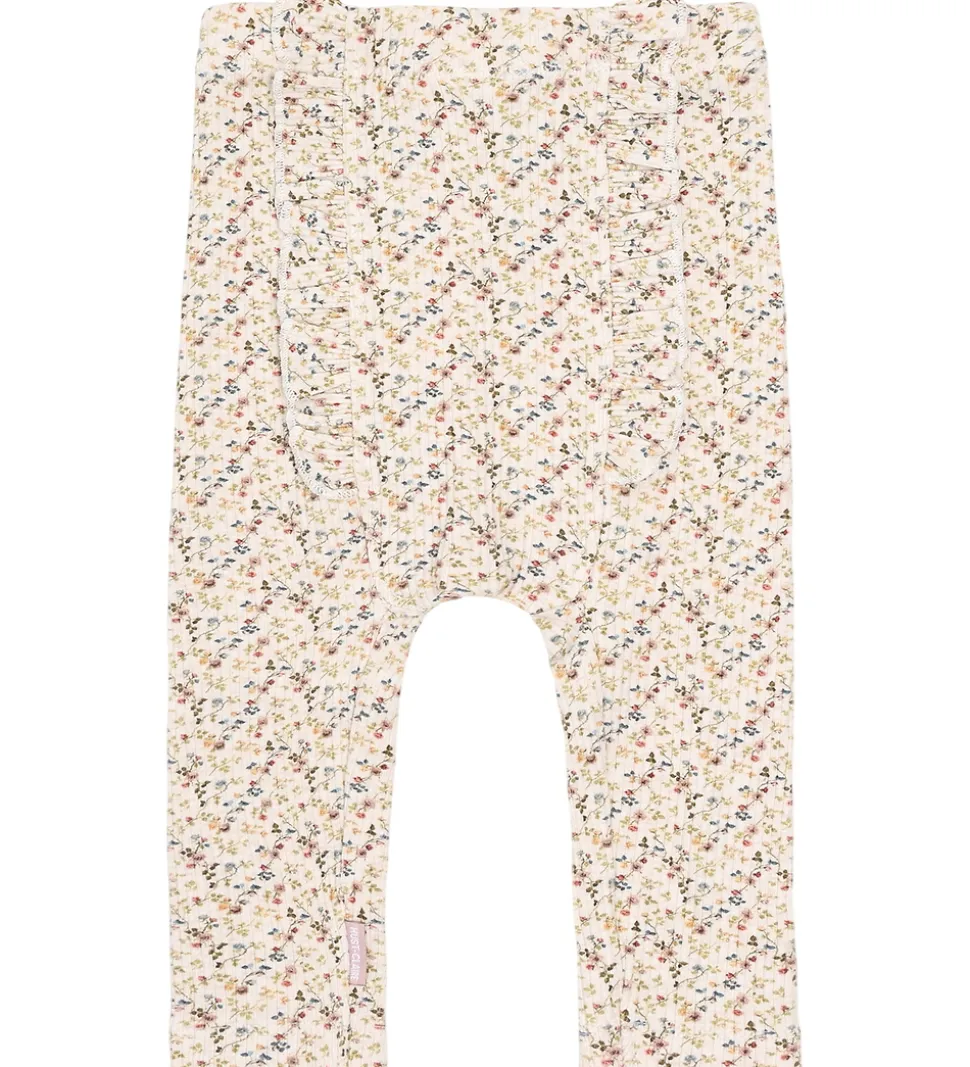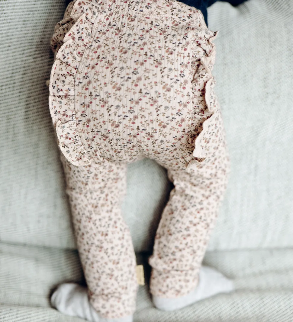Fine Hust and Claire leggings i beige med blomsterprint i flotte farver. Leggingsene har ribstruktur og elastisk talje. Bagpå er der flotte flæsedetaljer, og i benåbningerne er der blondekanter i rosa. Leggingsene er fremstillet af økologisk bomuld og modal.