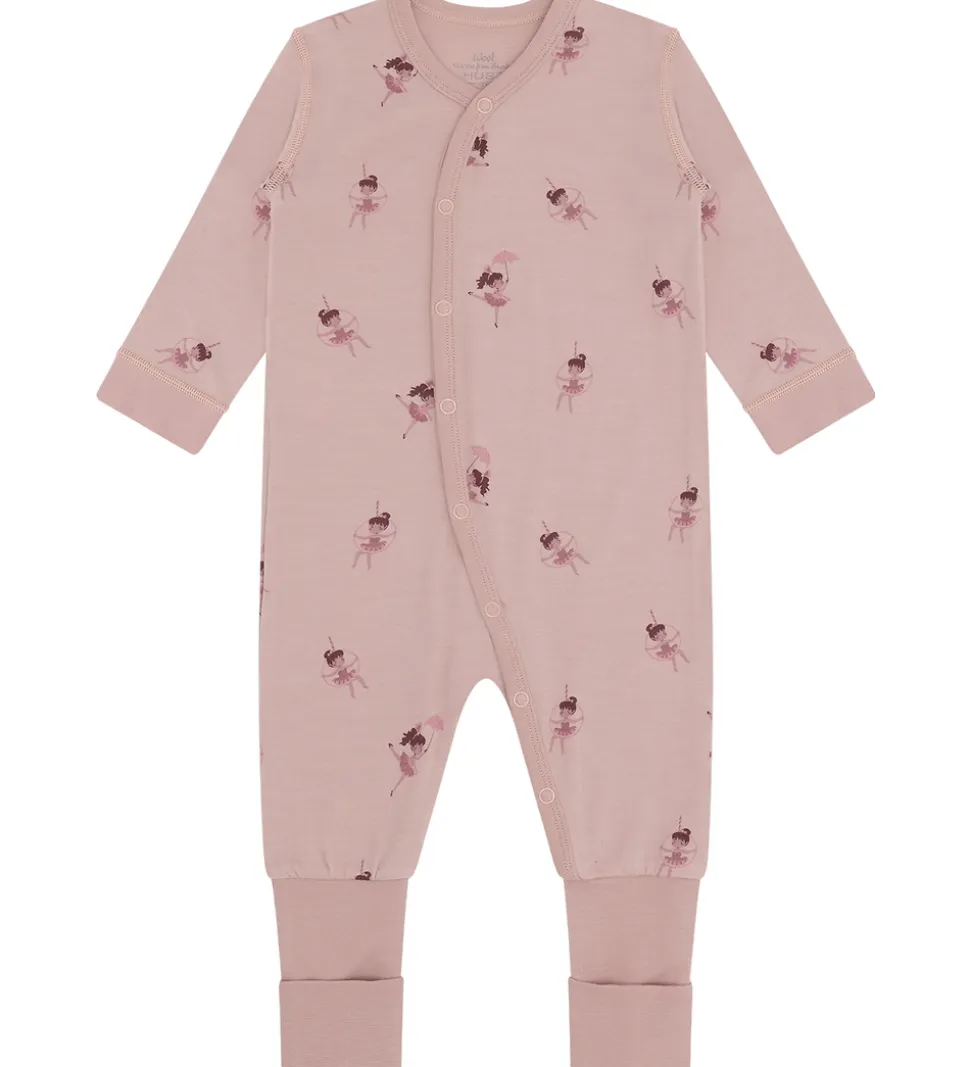 Charmerende Hust and Claire natdragt i rosa med et sødt ballerina-print. Natdragten har lange ærmer og lukkes foran med praktiske trykknapper fra hagen til venstre fod. Natdragten har lange ben med brede ribkanter og mulighed for ombuk til lukkede fødder. Den er fremstillet i en blød kvalitet af uld og bambus viskose.