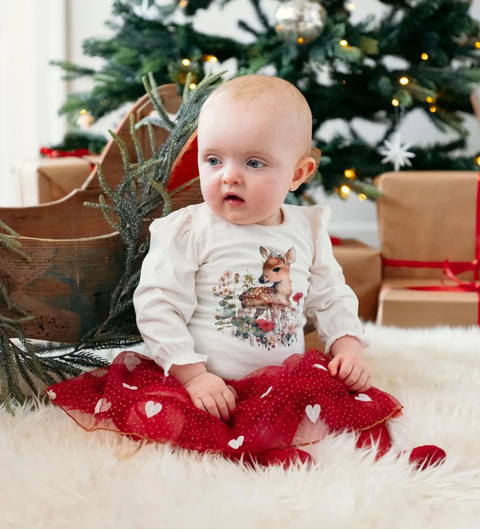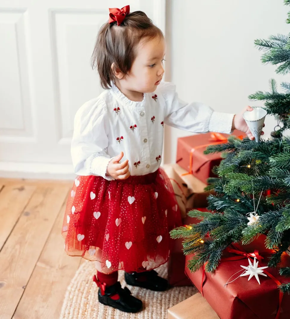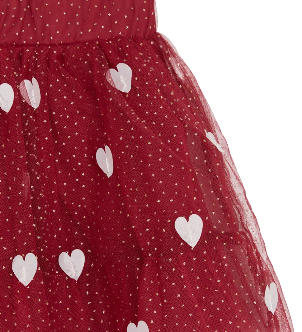 Skøn Hust and Claire nederdel i en rød nuance med hvidt hjerteprint og fine detaljer. Nederdelen har en afslappet pasform og gir et legende udtryk til enhver påklædning.