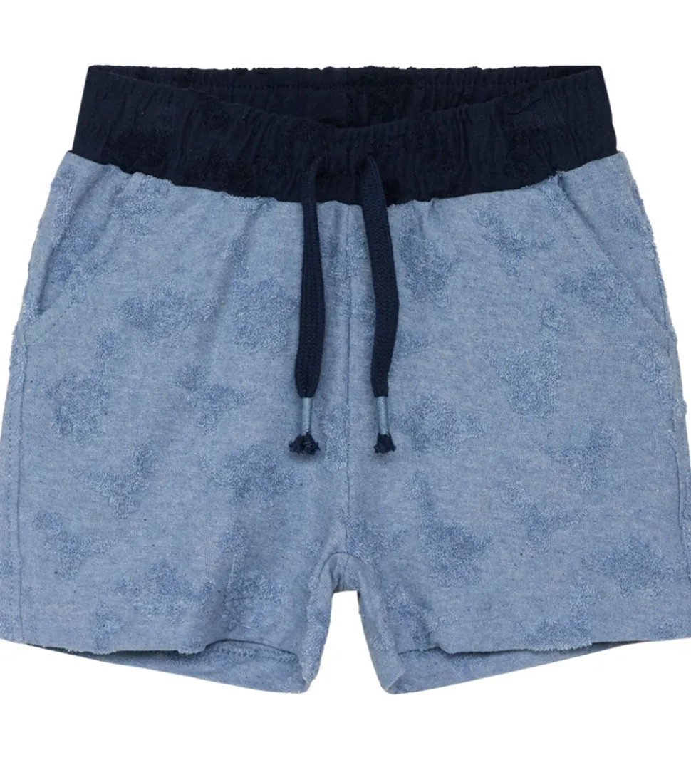 Stilfulde Hust and Claire shorts i en blød blå nuance med en diskret frotté-struktur af dinoer, der tilføjer karakter til designet. Hust and Claire shortsene har en praktisk elastisk kant i livet med snøre for en justerbar pasform og funktionelle lommer på begge sider.