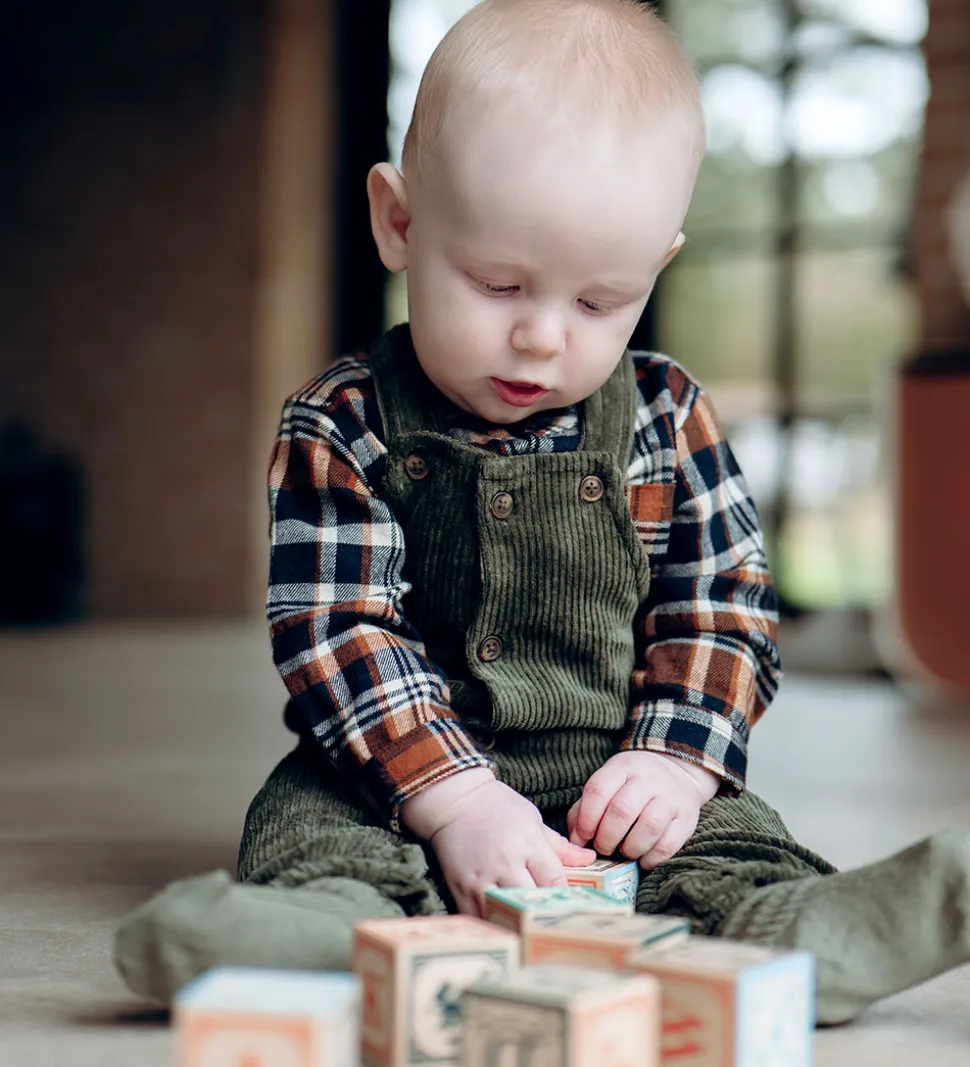 Praktisk Hust and Claire skjortebody med et flot ternet mønster i nuancer af blå, brun og hvid i toppen, og i bunden er den beige. Bodyen har lange ærmer og en smart krave samt en lomme på brystet. Hust and Claire har designet bodyen med knaplukning foran, hvilket giver et klassisk udtryk.