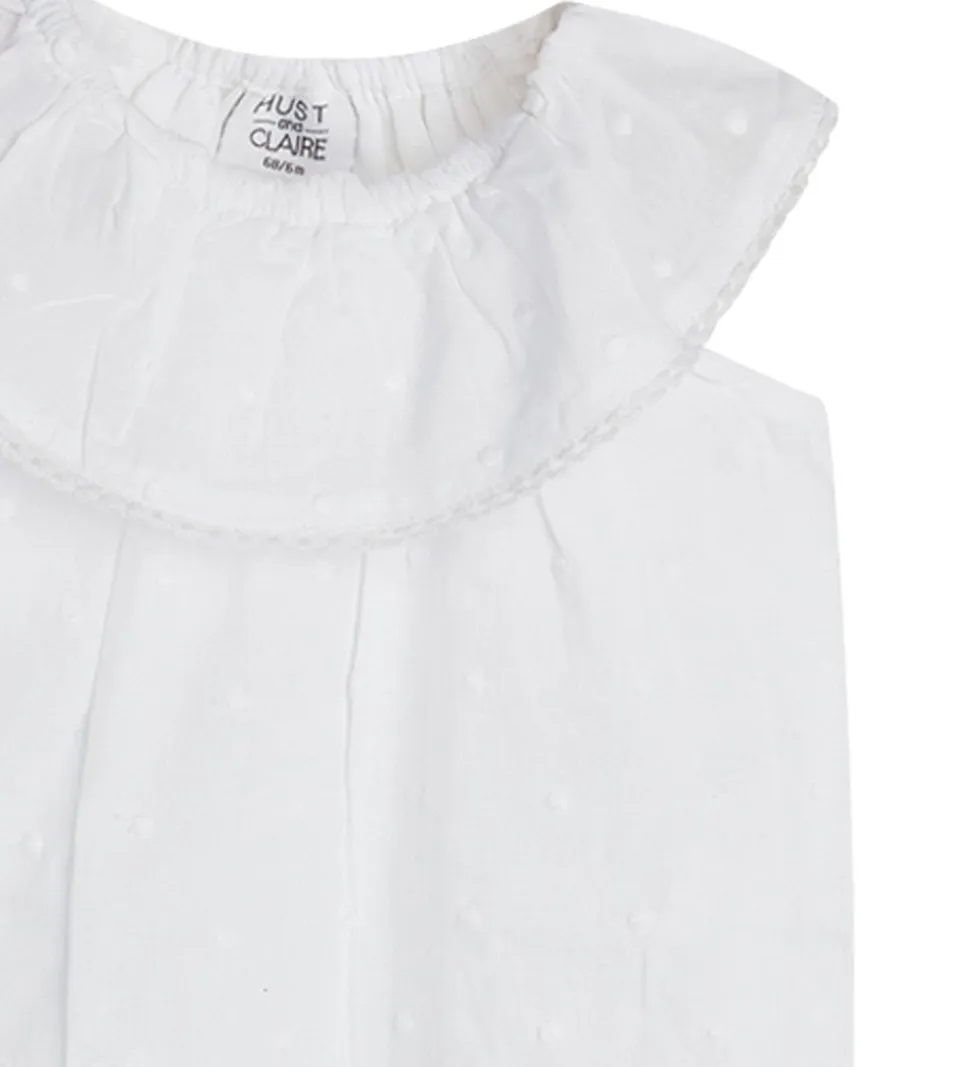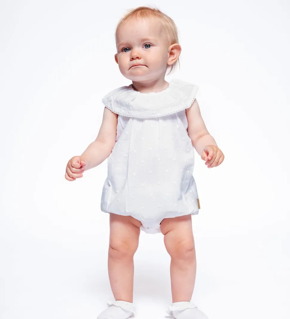 Yndig Hust and Claire sommerdragt i hvid med dekorative broderinger og fin flæsekrave.