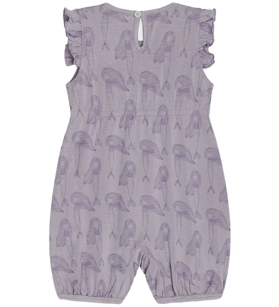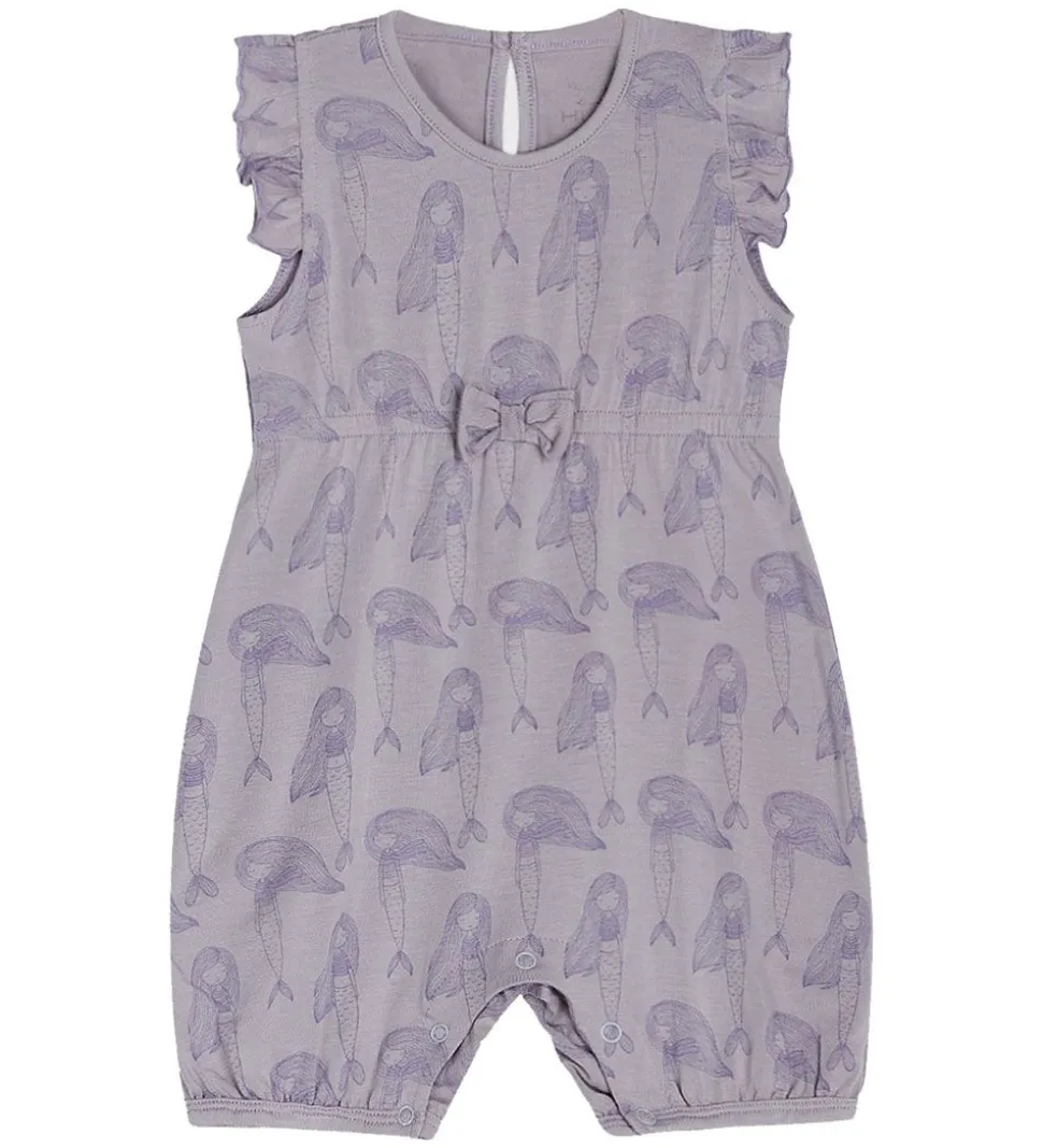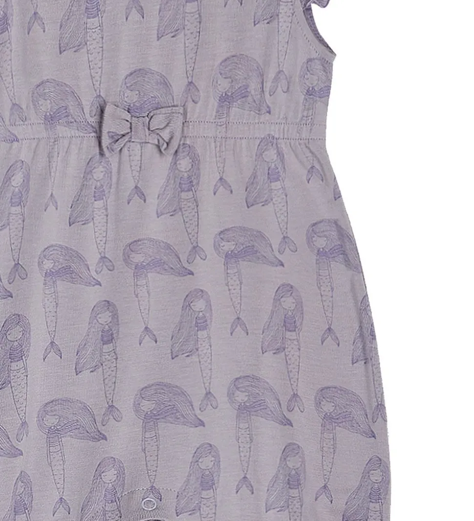 Yndig Hust and Claire sommerdragt i støvet lilla, med print af havfruer i lilla over det hele. På brystet er der en dekorativ sløjfe og i begge skuldre er der en fin flæse.