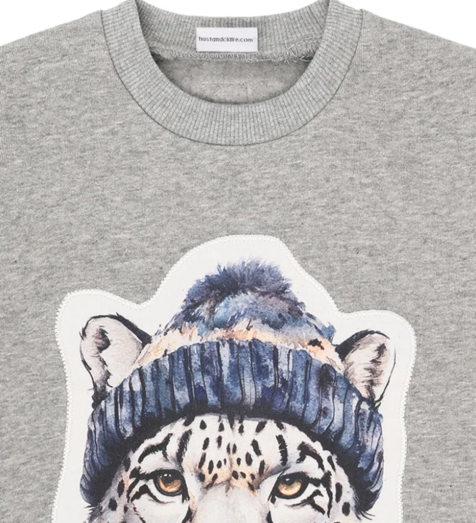 Smart Hust and Claire sweatshirt i meleret grå med et unikt print af et sneleopard, der bærer en mørkeblå hue. Hust and Claire sweatshirten har en rund hals og lange ærmer, som sammen med ribkanter i hals, ærmer og bund skaber en klassisk struktur. På indersiden har den blødt, børstet bomuld.