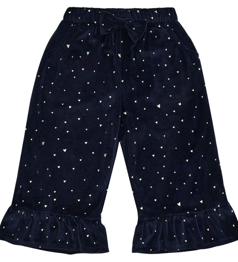 Elegante Hust and Claire velourbukser i navy velour med et print med små, guldfarvede hjerter. Hust and Claire velourbukserne har lange ben med et lige snit og en god vidde, og buksebenene har en fin flæse langs kanten. Velourbukserne har en justerbar elastikkant, og fortil sidder der en flot sløjfe. I siderne er der praktiske lommer.