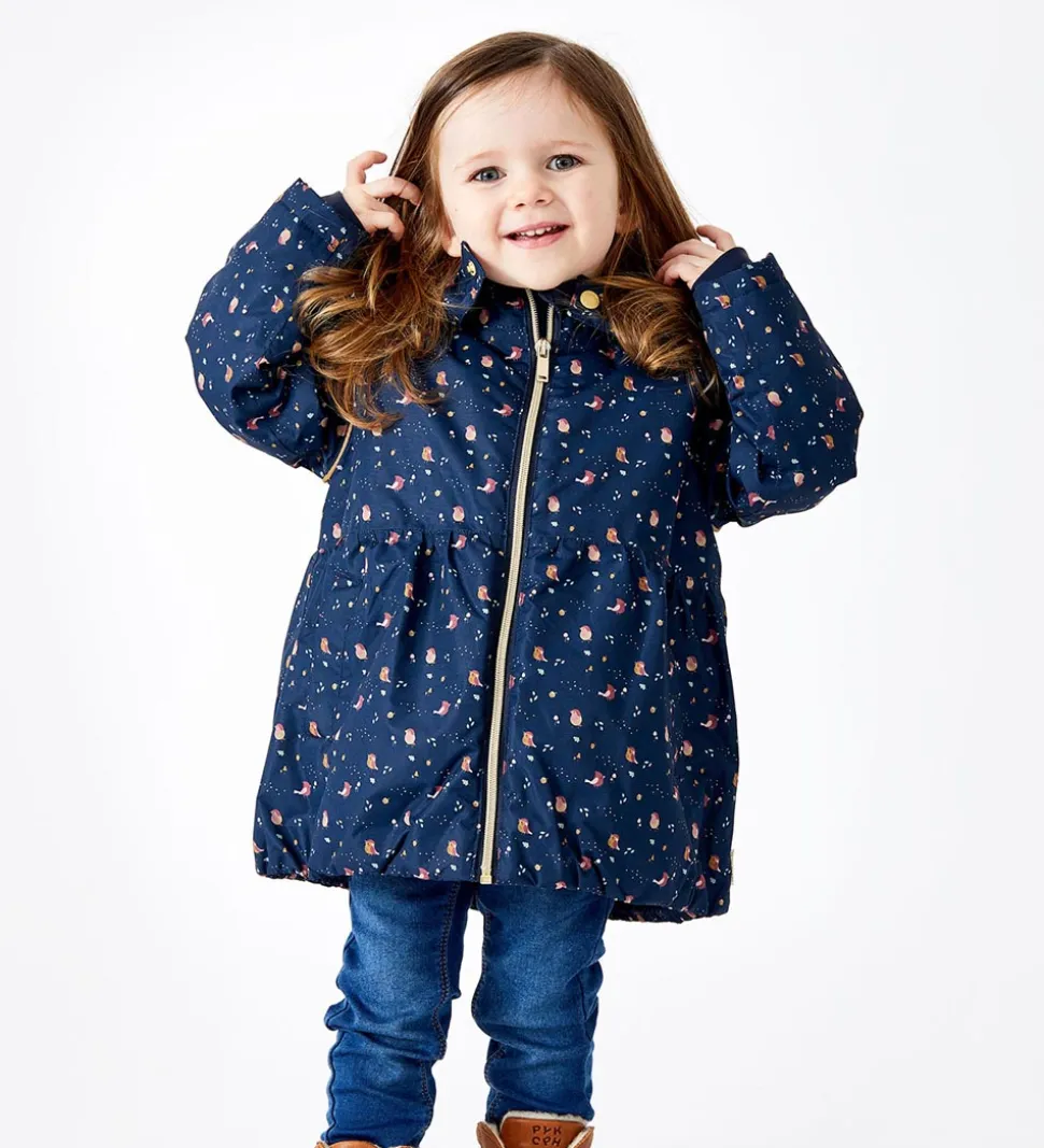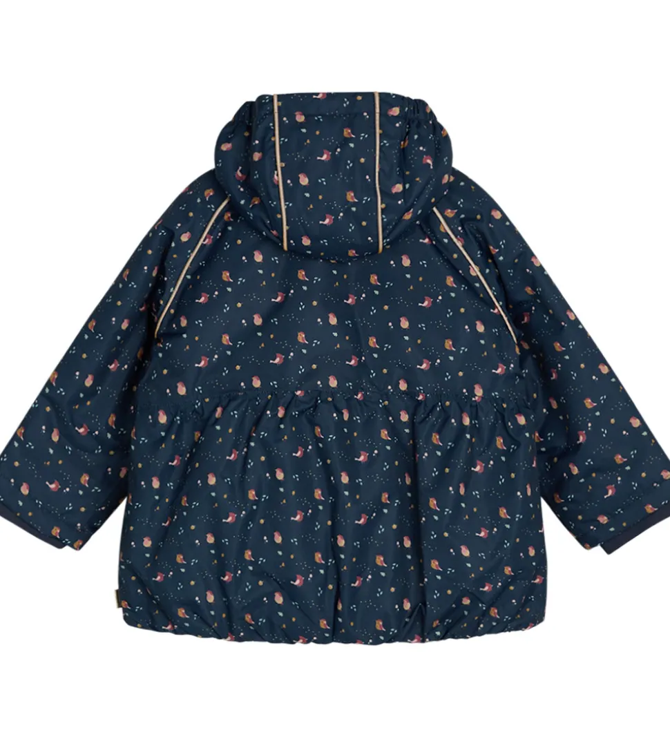 Lækker Hust and Claire vinterjakke i navyblå med et alloverprint af små fugle i rosaog gyldenbrun. Vinterjakken har fine, gyldne trykknapper, lynlås og reflekspipings.