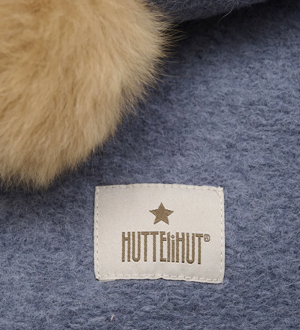 Smart Huttelihut elefanthue i en afdæmpet, blå nuance. Huttelihut elefanthuen består af to lag, har en rund hovedform og er udstyret med to kvaster af blødt alpakkapels. Ribkanten sikrer en god pasform.