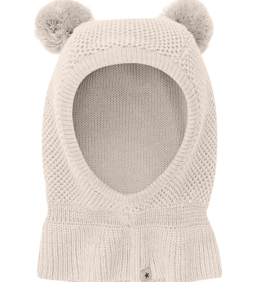 Huttelihut elefanthuen har en rund hovedform med en bred ribkant i ansigtsåbningen og rundt om halsen. Ved ørene er der et praktisk vindstop, som beskytter mod vinden. Elefanthuen er lavet af lunt merinould på ydersiden, mens foring er af bomuld.