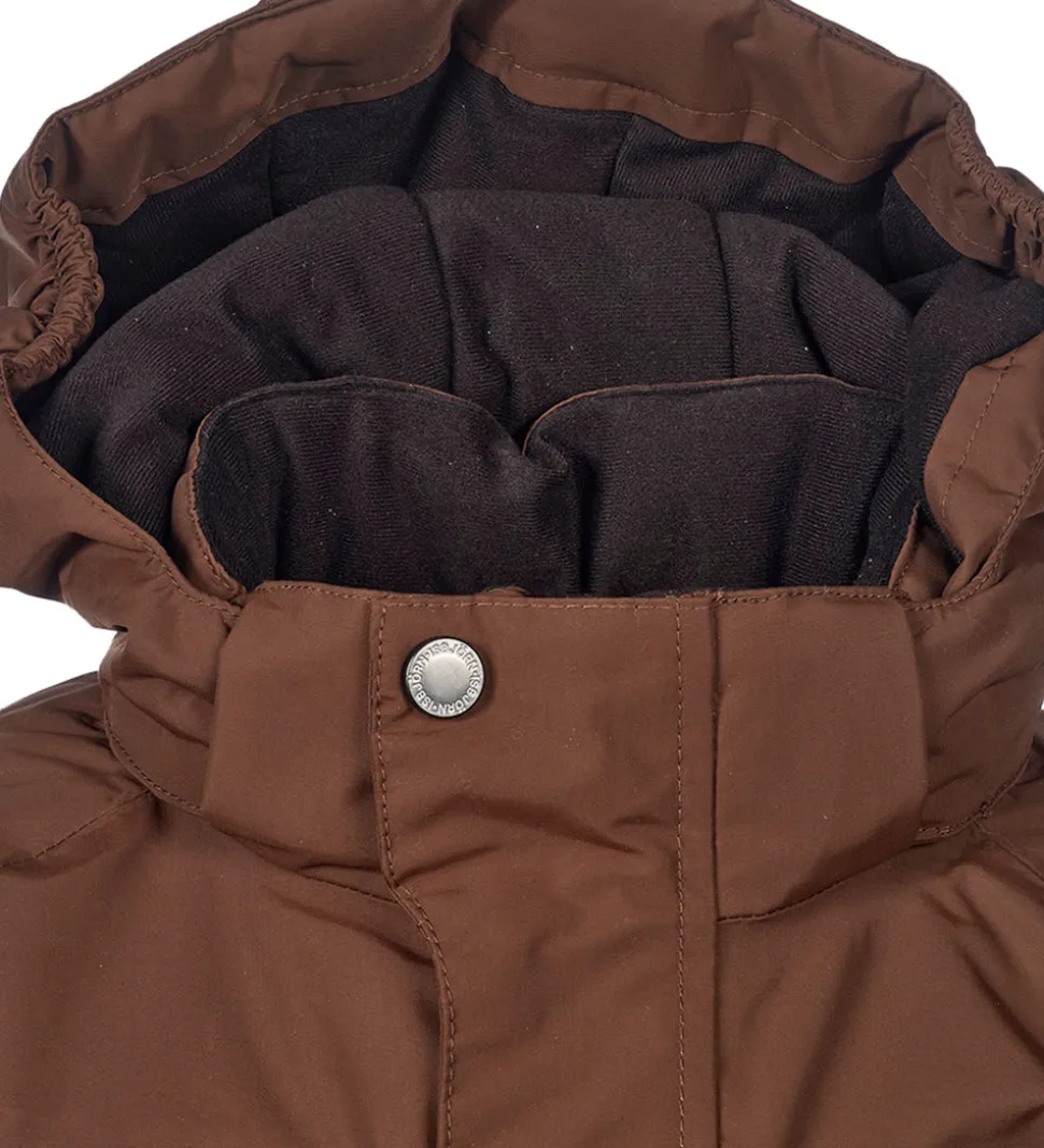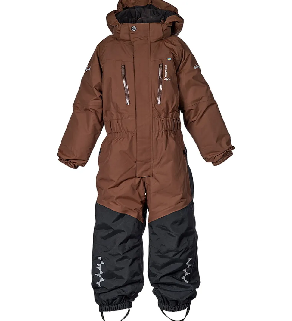 Flot Isbjörn Of Sweden flyverdragt i brun og sort. Flyverdragten har hvide logoprint på venstre bryst og hætten samt smarte refleksprint på lænden, begge skuldre og ankler.