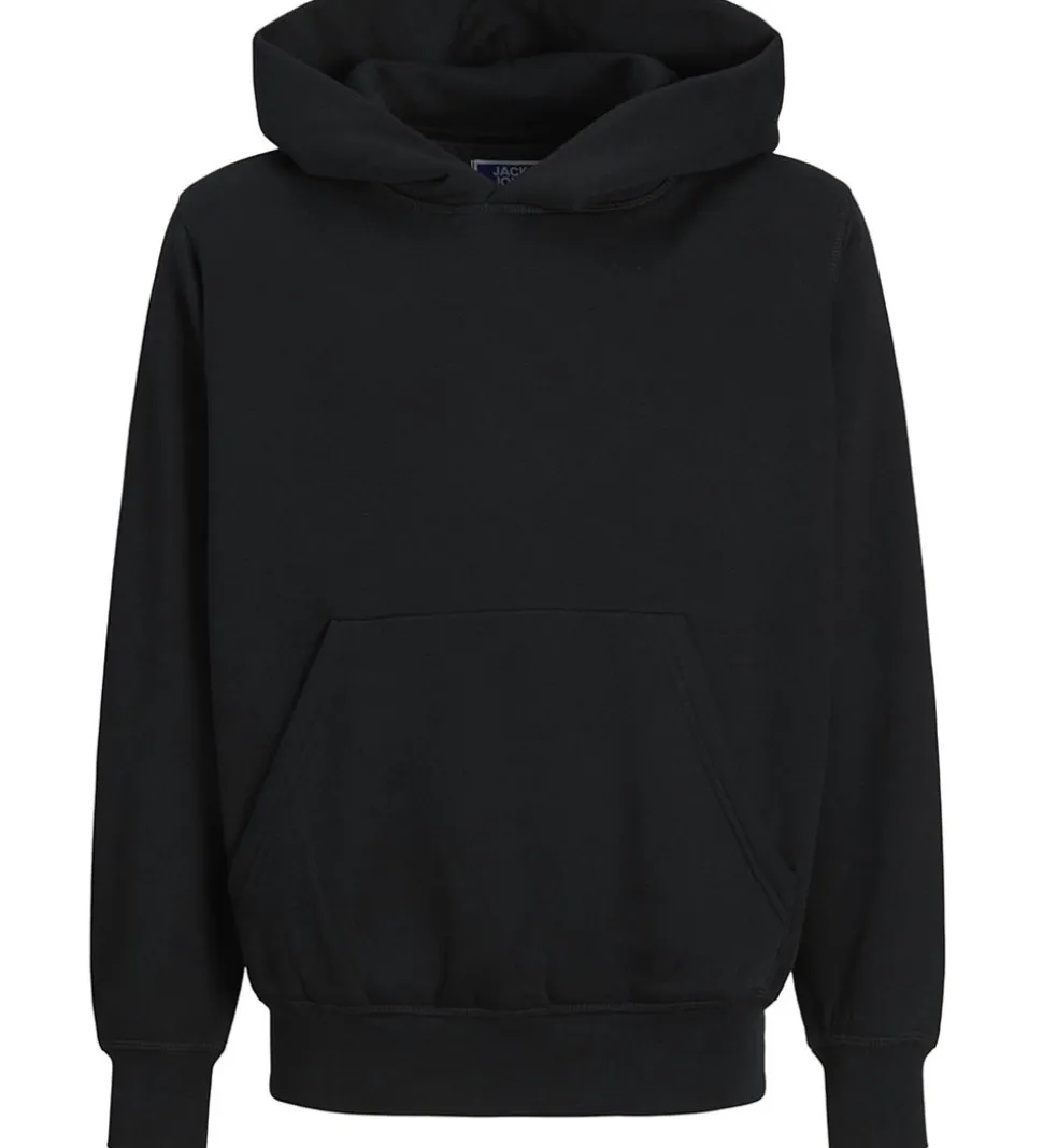 Smart Jack & Jones hættetrøje i sort. Jack & Jones hættetrøjen er lavet i en kraftig kvalitet med en blød hætte og lange ærmer. Den har brede ribkanter i ærme- og taljeåbning. Indvendigt er der blødt, børstet bomuld.